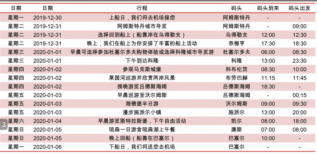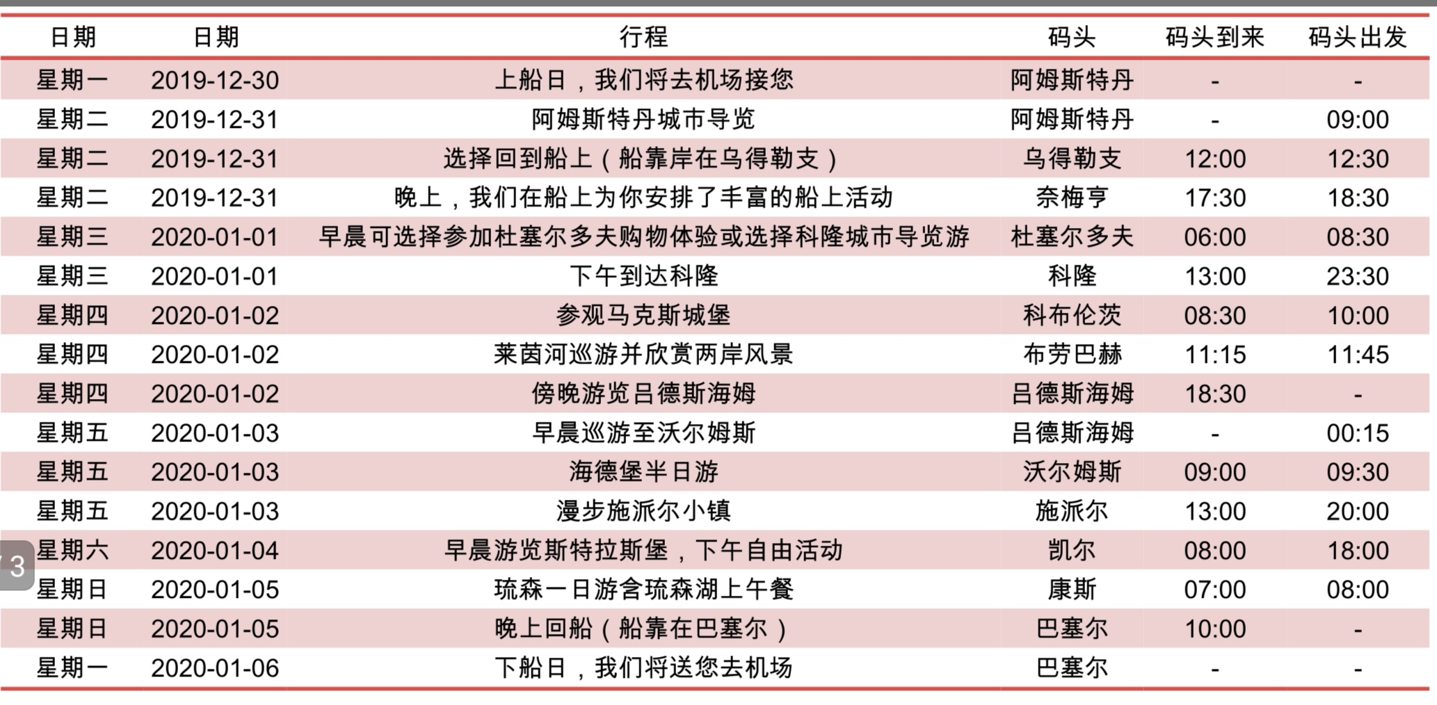 正好计划要携带爸妈出游,这几个点稳稳戳中我的心。19年5月下的单,预定了12月30日莱茵河8日的行程。选取这段考虑点也是两个:一个主要是我休假问题,年底假好请,还可以顺便船上跨个年。第二是年底折扣力度大,85折+2388船票,加上母亲节活动,每个人减300,再送300船上消费券。