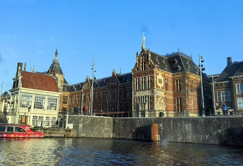 乘玻璃船游览阿姆斯特丹才能真正体会水城的独特韵味。游船穿行在著名的河道间,河道两旁是典型的荷兰传统民居建筑。图为阿姆斯特丹火车站。