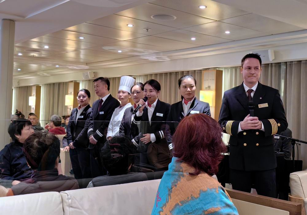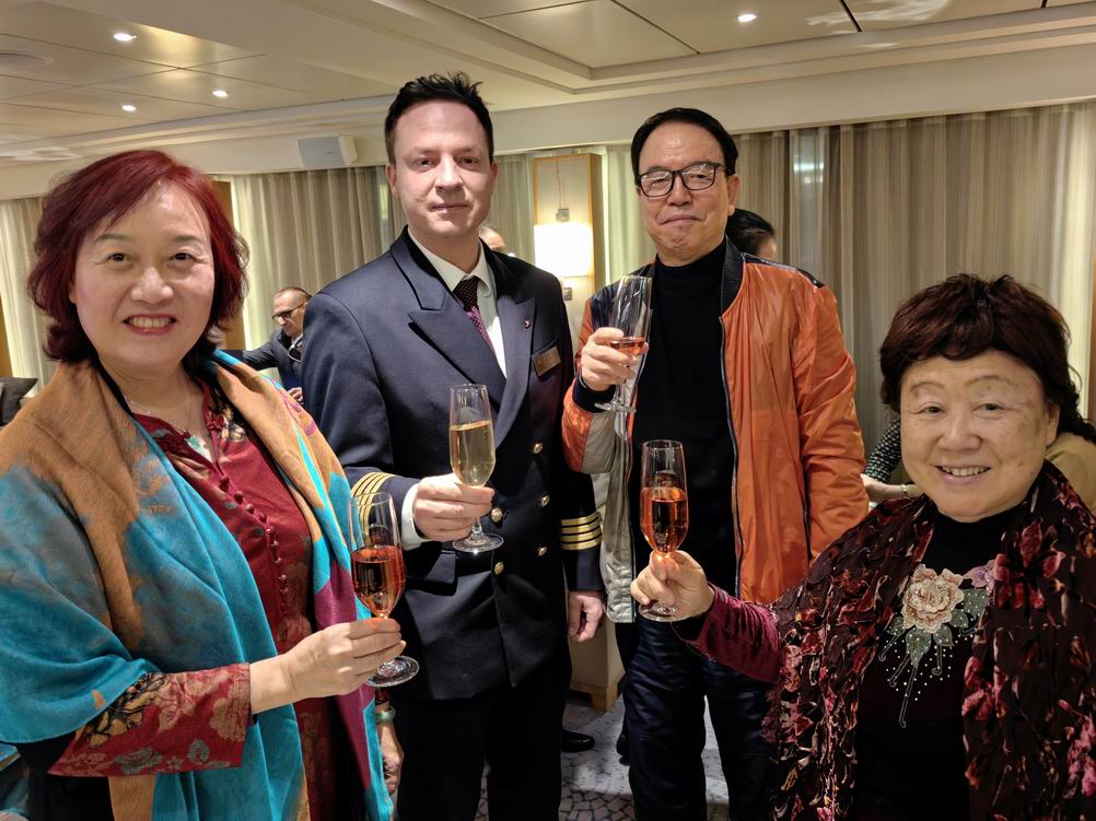 艾斯特拉号船长欢迎晚宴分为两个部分,第一部分是船长见面会。图为船长和和高级船员与游客见面。可以看出,艾斯特拉号的高级船员,大部分是中国人!