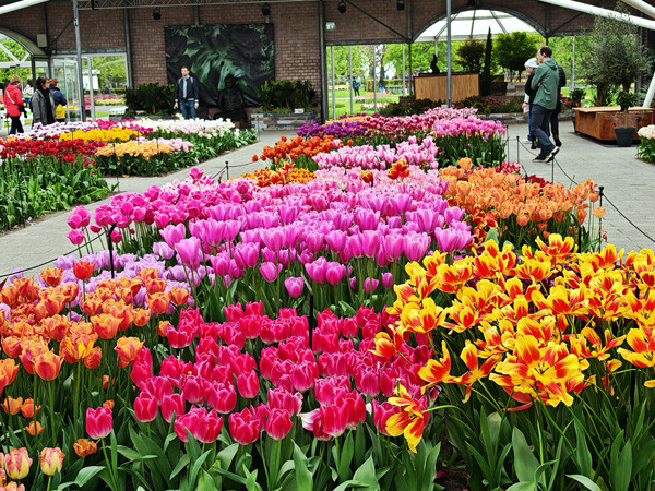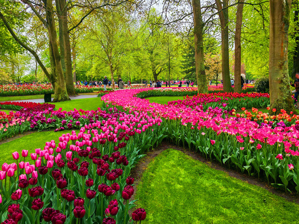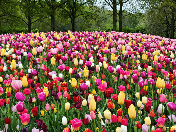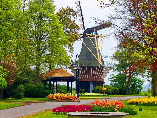 特别是登上库肯霍夫园中风车瞭望台,俯瞰公园外一望无际的花田,700万株郁金香组成的花毯尽收眼底,那种场面,真是让人感觉十分壮观。