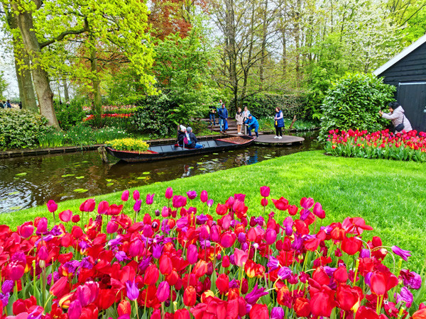 从风车下来不远就是乘坐游船的码头,游人泛舟,沿着运河漂流,从水上欣赏花海,船游所到之处,人们可以从不同的角度观赏与感受郁金香公园的魅力。