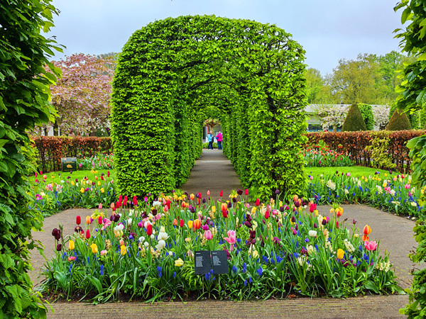 穿梭漫游在由15种颜色组成的彩虹步道,只见两侧的郁金香形成了鲜花隧道,犹如在花海中漫步前行。