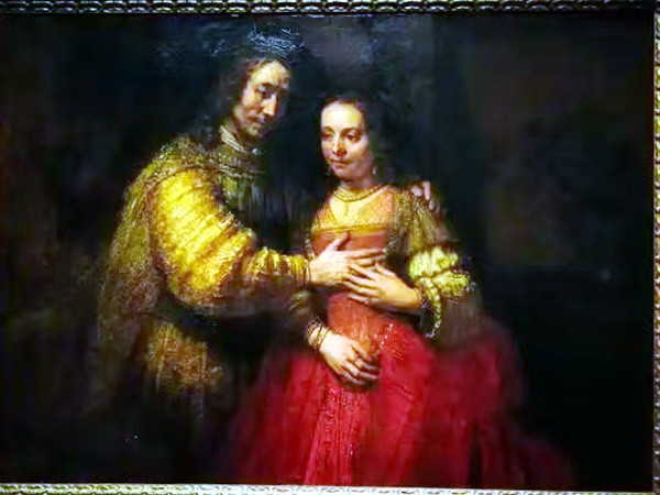 这幅巨作以其精湛的光影运用和生动的人物刻画,展现出荷兰黄金时代的绘画巅峰。旁边的《犹太新娘》,人物神态细腻,色彩温暖,让人感受到伦勃朗对人性的深刻洞察。
