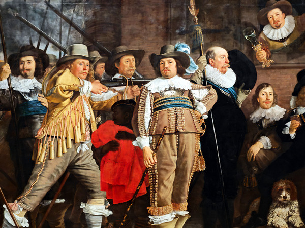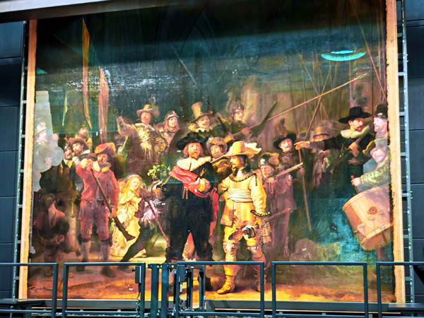 在“荣誉廊”中,只见伦勃朗的《夜巡》被放置在独立展厅赫然在目,画中人物布局合理,光影处理精妙,生动地展现出商会成员巡视城门的场景。
