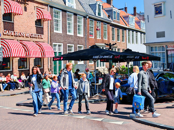 由于当天正逢庆祝二战胜利荷兰解放日,因此这里更是格外热闹。中心广场的舞台正在上演着一场热烈欢腾的歌舞表演。沿着霍夫特大街漫步,还能看到许多街头艺人在表演。他们有的演奏着美妙的音乐,有的展示着精湛的杂技,为这条街道增添了一份活力与欢乐。街边的花店摆放着各种鲜艳的花朵,花香四溢,让人心情愉悦。