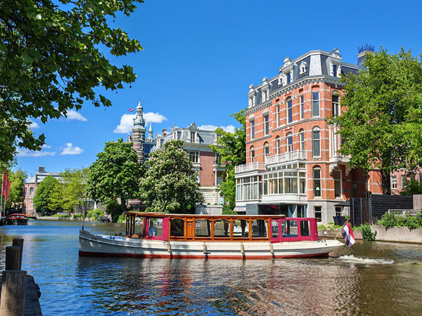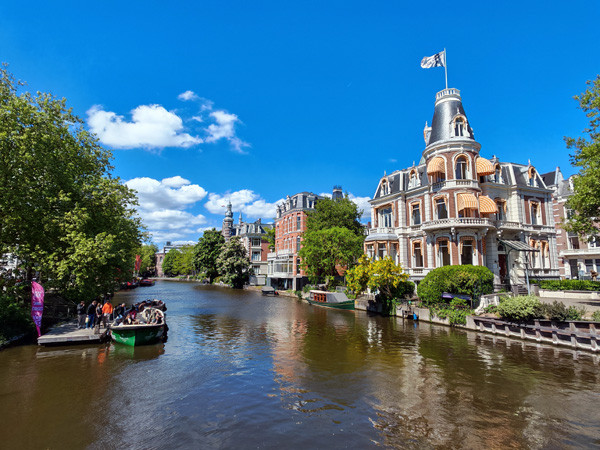 周边运河水清澈见底,在阳光照耀下波光粼粼。河水流速较为平缓,宛如一条碧绿的丝带,蜿蜒穿过阿姆斯特丹的老城区,为城市增添了灵动之美。特别是船游泛舟,分外惬意。