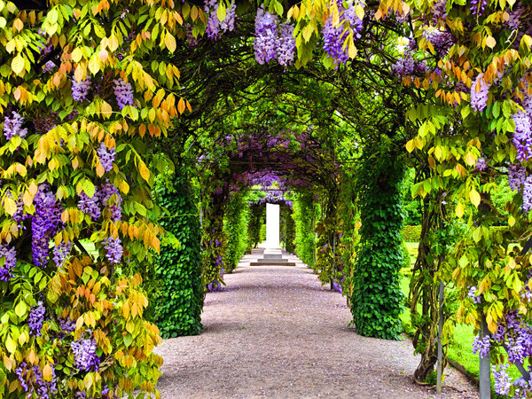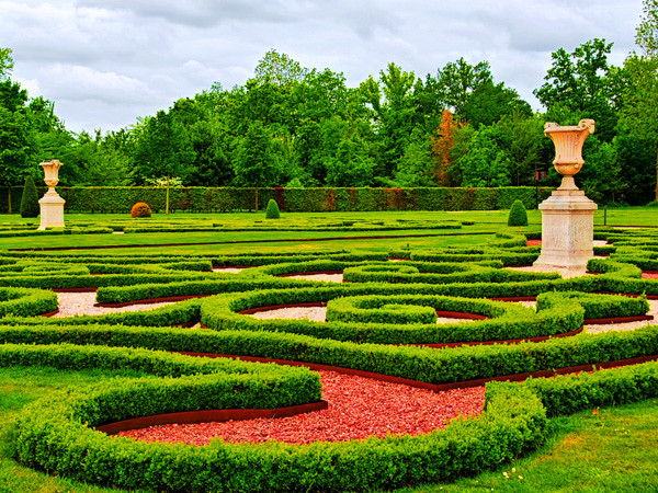 来到城堡的花园,这里是一大亮点,占地广阔且布局精巧。这里有精心修剪的宫廷式花园,各种形状、颜色的花圃错落有致,白色碎石铺就的行人道穿梭其中。