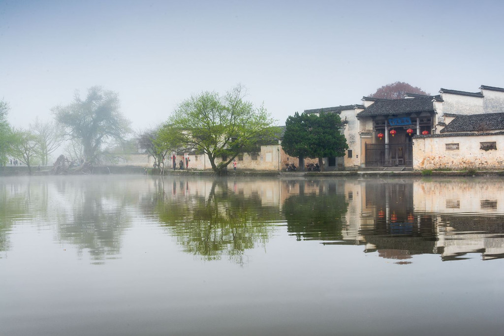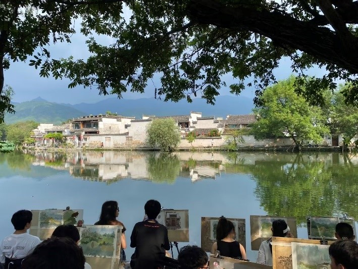 宏村被誉为"画中的村庄",宏村因"扩而成太乙象,故而美曰弘村",清乾隆年间更为宏村。南湖位于宏村南首,建于明万历丁未年(1607年),宏村村落经永乐年间到万历年间,楼舍连栋,高低错落,人口繁衍,光靠月塘蓄水已经不够用,又在万历年丁末年将村南百亩良田,凿深数丈,周围四旁砌石立岸,仿西湖平湖秋月式样,建成南湖。南湖整个湖面倒影浮光,水天一色,远峰近宅,跌落湖中,加之树荫水深和日光的相互作用,明暗协调,动静相宜,显得幽深、雅静、清新、明丽。南湖四时景色不同,日夜风光各异。清人有诗,夹岸桃李花,浓英殊窈窕,入夏菱荷香,镜面净为扫,最是夜阑风浪静,楼台灯火半模糊。每日来宏村南湖边写生的人络绎不绝,从清晨到黄昏,来自全国各地、院校艺术生、大大小小男男女女,画架画笔画中景形成南湖沿岸一道亮丽的风景线。