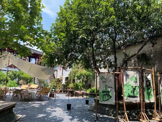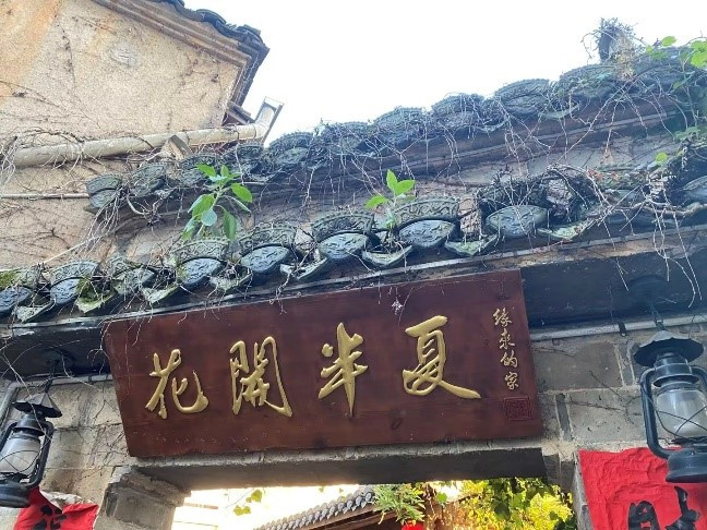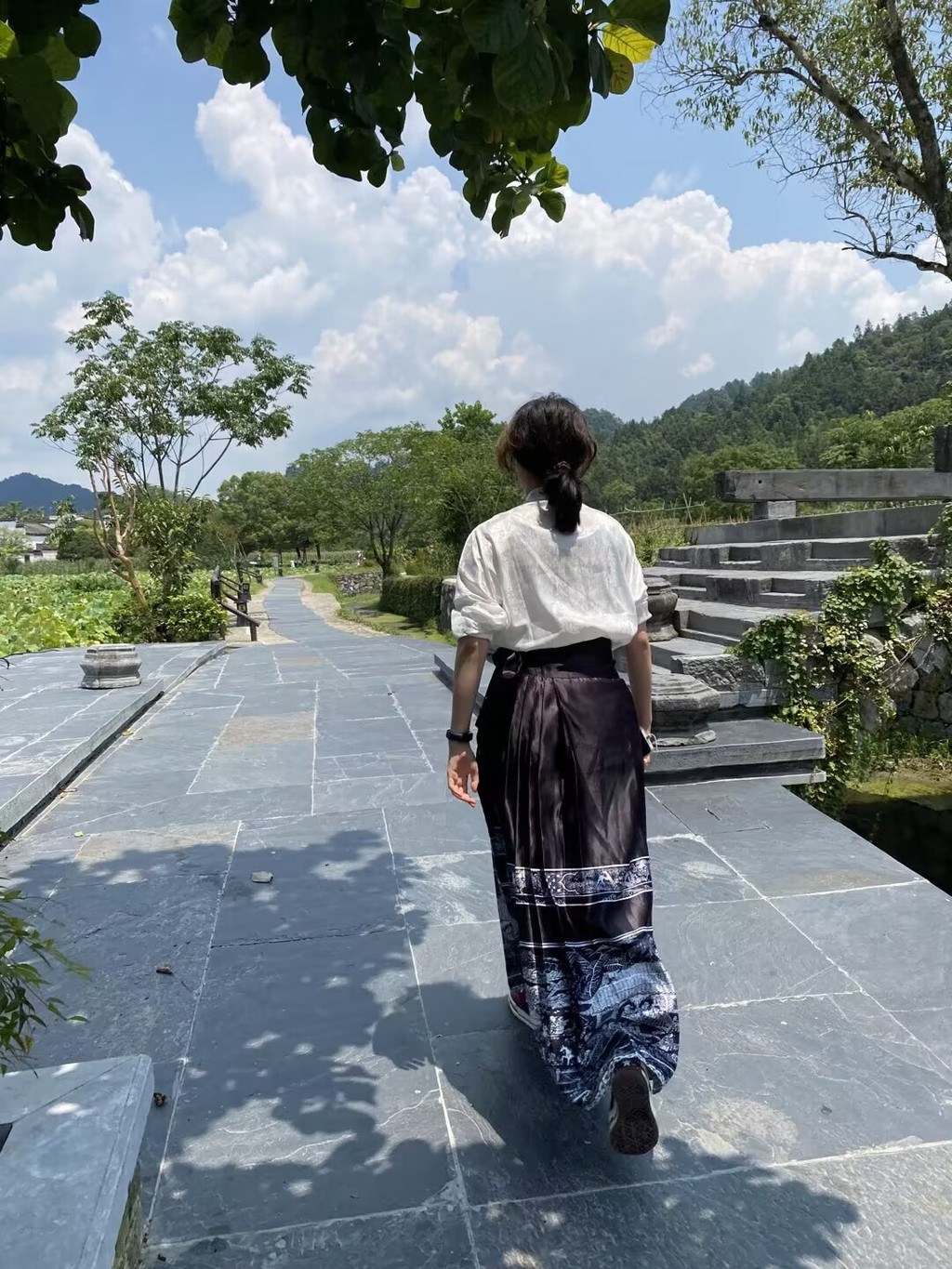 在此起彼伏的蝉鸣声中,我们一路穿过九十九条曲径通幽的巷子,西递的巷子仿佛是一座迷宫。这里的高墙之下没有窗,因为男人出门做生意,深宅大院里的女人怕惹闲话,高高的马头墙对留居在家的女人是一种保护。同时也是对火灾与盗贼的一种防范。这里的窗户全部开在房顶,采光良好,更有冬暖夏凉之奇效。天窗落下的雨水即被喻为财,肥水不流外人田,滴进屋内的水会由专门的排水口缓慢细流地排到屋外。这里的巷子粉墙黛瓦,窄小而幽长,有的只能容两三人并肩,遇到他人迎面走来,需要侧着身子相互让行通过。这里巷子墙头的瓦片之间盛开着一排排叫不上名字的野花,徽州深浅浓淡的留白,好似一幅幅水彩画,流淌着安宁与从容,夏日水墨田园的气息扑面而来。身着马面裙行走在街头巷尾真的是很应景!
