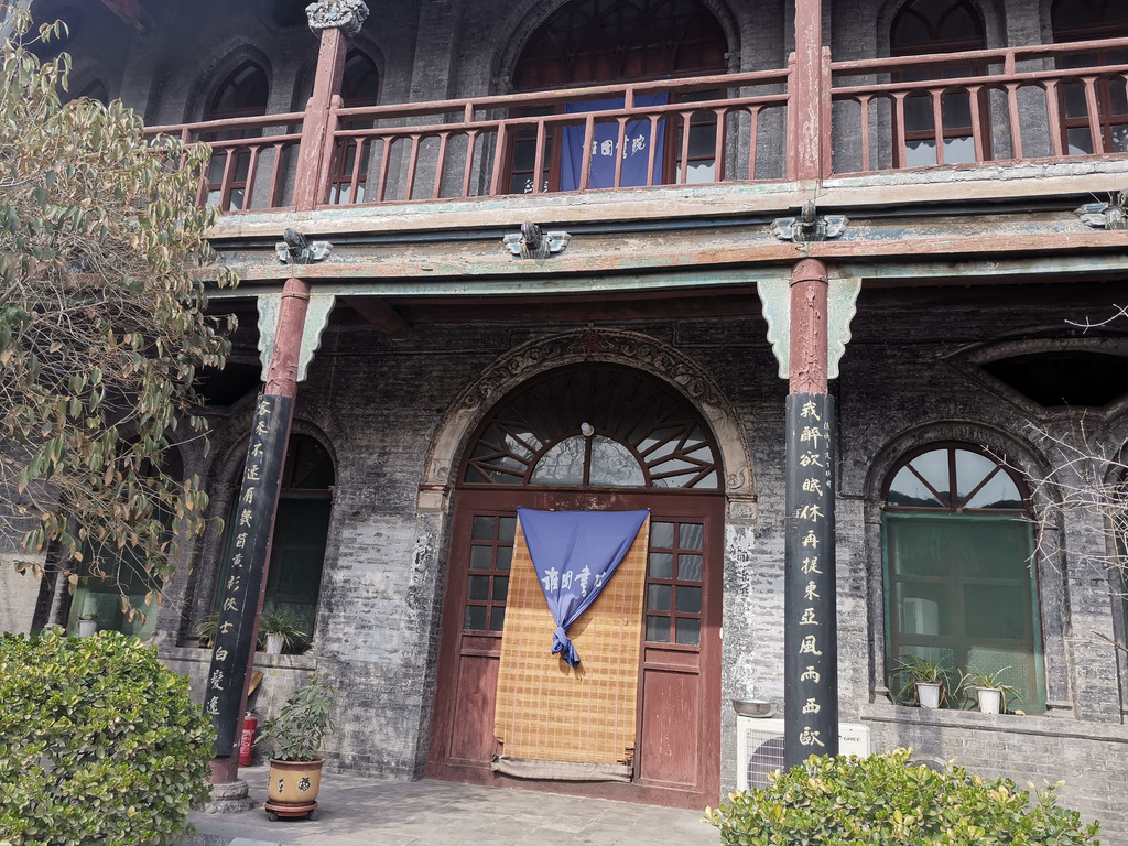 我们来到书院楼参观,还上到了楼上,当年的周边环境还是很好的,登高望远,远处的霍山尽收眼底。书院楼也是张瑞玑居住和接待客人的地方,门框上的楹联也出自其手,今天看来依然值得品味,如“有酒学儒无酒学佛 刚日读史柔日读经”、“驽马恋残豆 鹰凖击风尘”、“宁有众无我 自做世界观”。