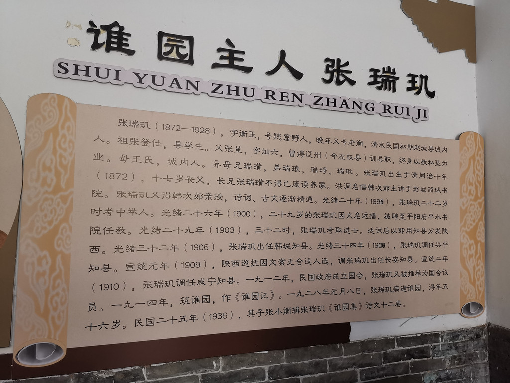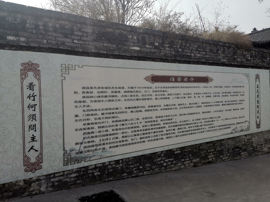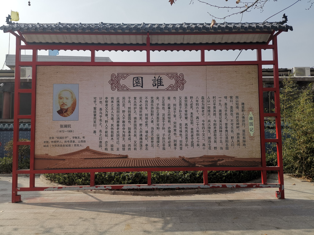 距离这里不远有一所名人故居,就是民国巨子张瑞玑的故居 “谁园”,谁园是张瑞玑起的,他为此还写了《谁园记》,意思是将来这里不知道会成为“谁的园子”,可能被子孙卖掉,也可能被官府没收。谁园修建于1914年前后,建筑风格是中西结合的砖木结构,目前能在外面看到闺阁楼、来熏斋、书院楼等,这里处于旅游新开发阶段,今后不知道能不能做成一个著名的景点。