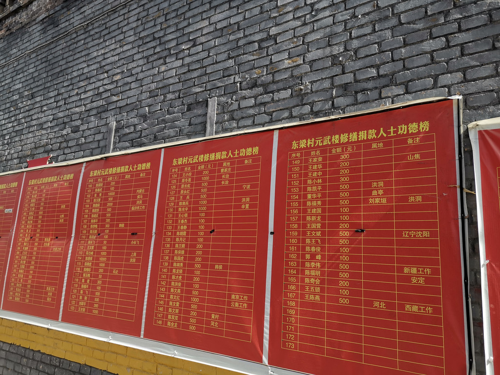 离开西义村,我们来到了东梁村,东梁村有一座元武楼,建于明代万历年间,村民正在集资修缮。在街上打听元武楼时,一位年纪较大的村民对我们还进行了盘问,估计是对陌生人有些不放心,尤其是我的外地口音。