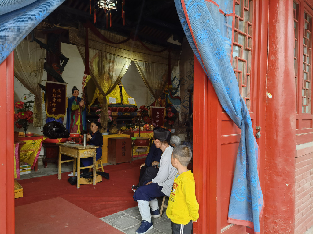 今年5月12日农历四月初一是弥勒佛的生日,村里起了集会,还请了蒲县蒲剧团唱戏,工友常心平约我前往,欣然同意,又约上韩明亮,我们就来到了明珠村。在弥勒古寺参观的时候,大殿里有一位说书先生在唱眉户剧《杨家将》,眉户剧也叫迷糊,是地方剧种,抑扬顿挫非常好听,说书先生,自拉自唱,手脚并用,琴、鼓、锣、梆等自己一人全活,这种艺人以前民间很多,现在很多都失传了。