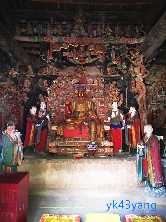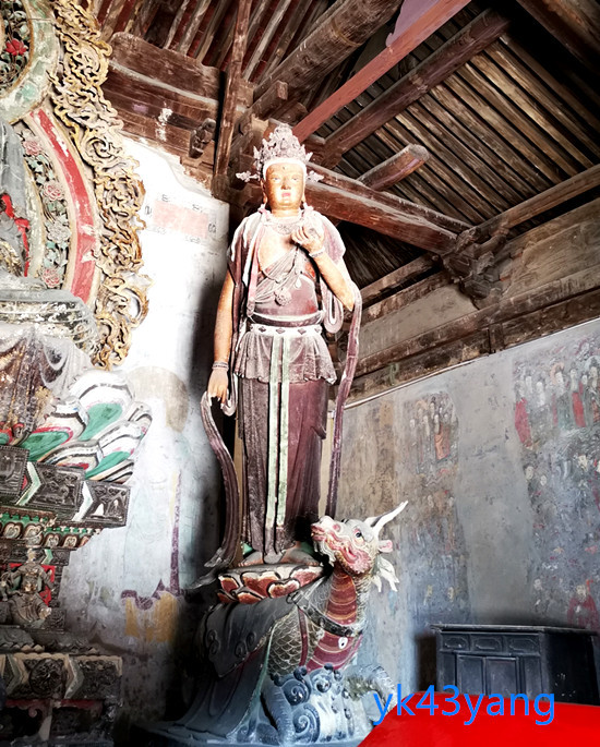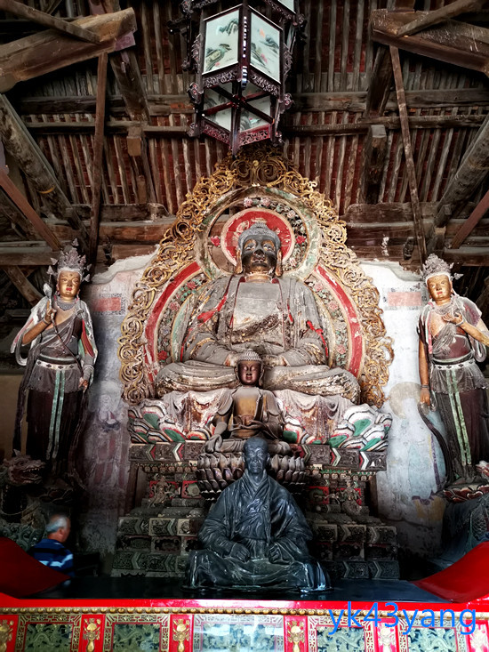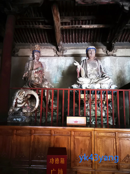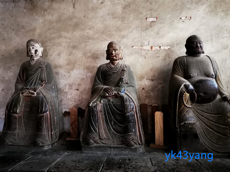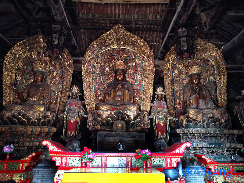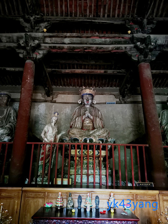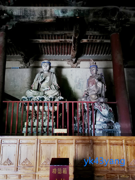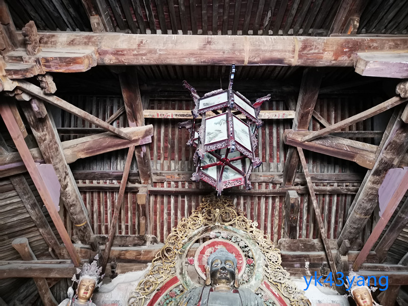 此殿既无匾额,也无楹联。许是历年损坏之故。抗战期间,这里曾作为的“太岳中学”教室,培养了不少爱国人士。前殿内现在供奉的是观音,文殊,普贤三大士。木雕似为新作。没有什么价值,但殿内的人字斜梁是我国古代建筑中罕见的实物孤例。