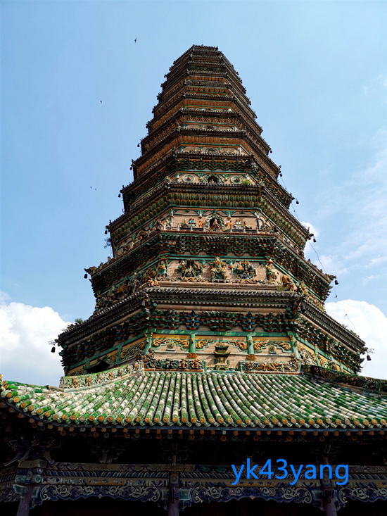 塔身呈正八角形,共十三层,高47.31米。塔身轮廓线不是魏晋隋唐以来常见的曲线,而是一条直线,看去稍显呆板。塔身由青砖砌成,并用黄绿蓝三色彩琉璃装饰,飞檐斗拱,彩色鲜丽如新。塔身满布雕塑,尤以二三层最为精致。整圈有佛像菩萨,金刚力士,花卉鸟兽,盘龙飞凤等等雕塑,造型精巧,彩色靓丽,令人叹为观止。