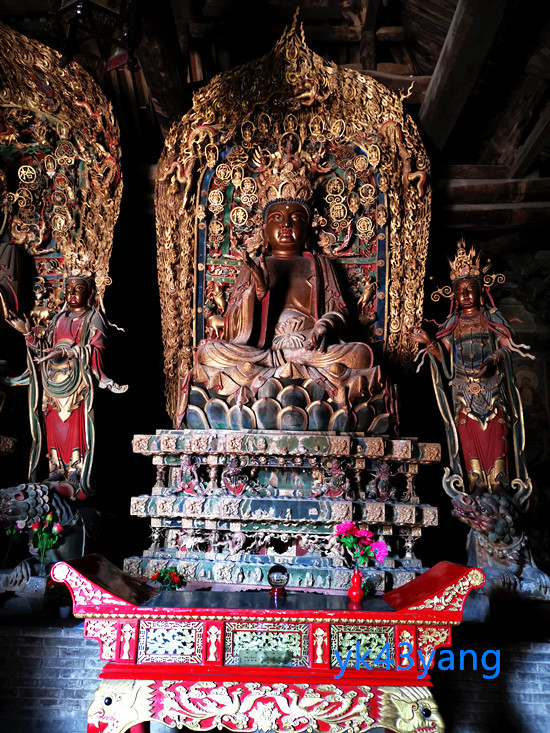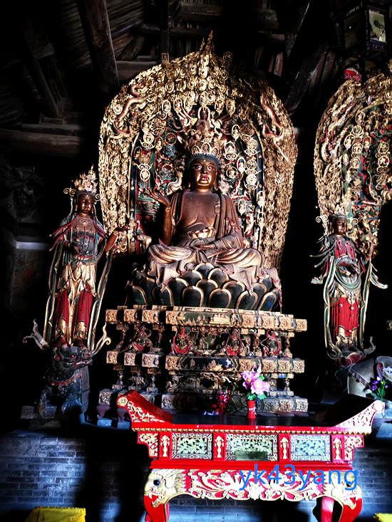 大雄宝殿内供奉华严三圣,即如来,文殊和普贤。中央的释迦牟尼佛为明代木雕,极为珍贵。
