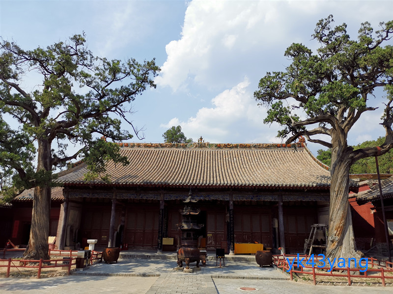 穿过弥陀殿,来到了上寺的第二进院。二进正面是大雄宝殿,殿前有两棵古树,奇怪的是树干扭转,而且两树旋向相反。传说古时寺内有两和尚,彼此不和,至死不变。死后化为两树,仍反向扭曲,不依不饶,互不理睬。其实和尚们听从佛祖教导,信仰相同,哪里会有什么不和谐?.自旋相反,乃是符合量子力学中的“泡林不相容原则”也!