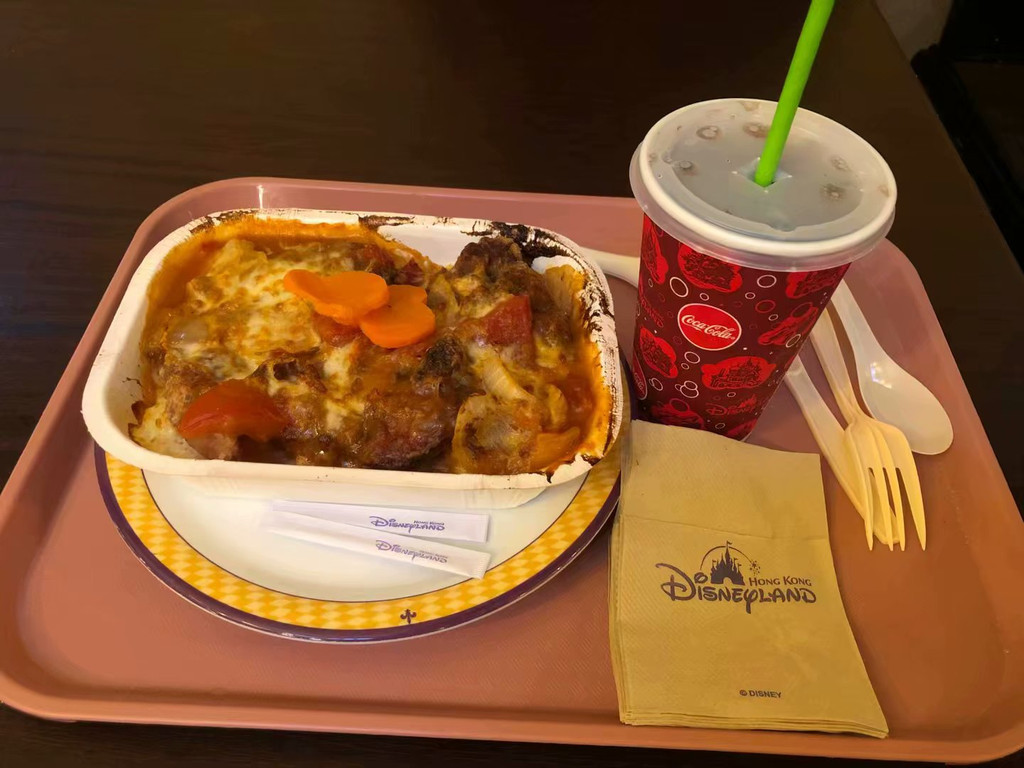 晚饭时间到了,玩了一天,已经累到不行,终于可以坐下来休息一下,点了一个芝士扒饭(晚餐票兑换),我和老公打算先吃点东西垫垫肚子,然后回到市区再找香港小吃。
