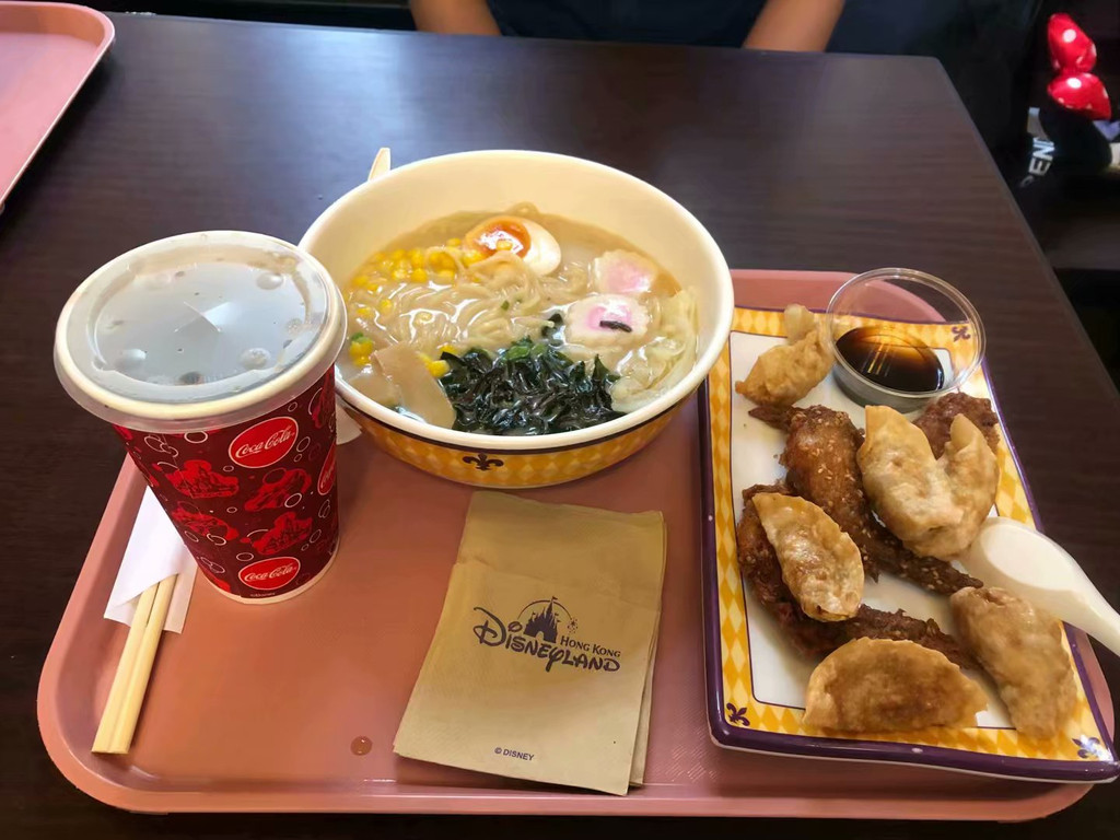 因为入园已经10点多了,排队玩了两个游戏,就到吃饭时间了,刚好旁边就是皇室餐厅,餐厅内部装修也很漂亮,进去补充一下体力再说。刚才正门换了餐票,一张午餐票,点了一个拉面(好像120港币)我和老公不够吃,再叫了一个饺子40多港币,幸好网上订了餐套票。