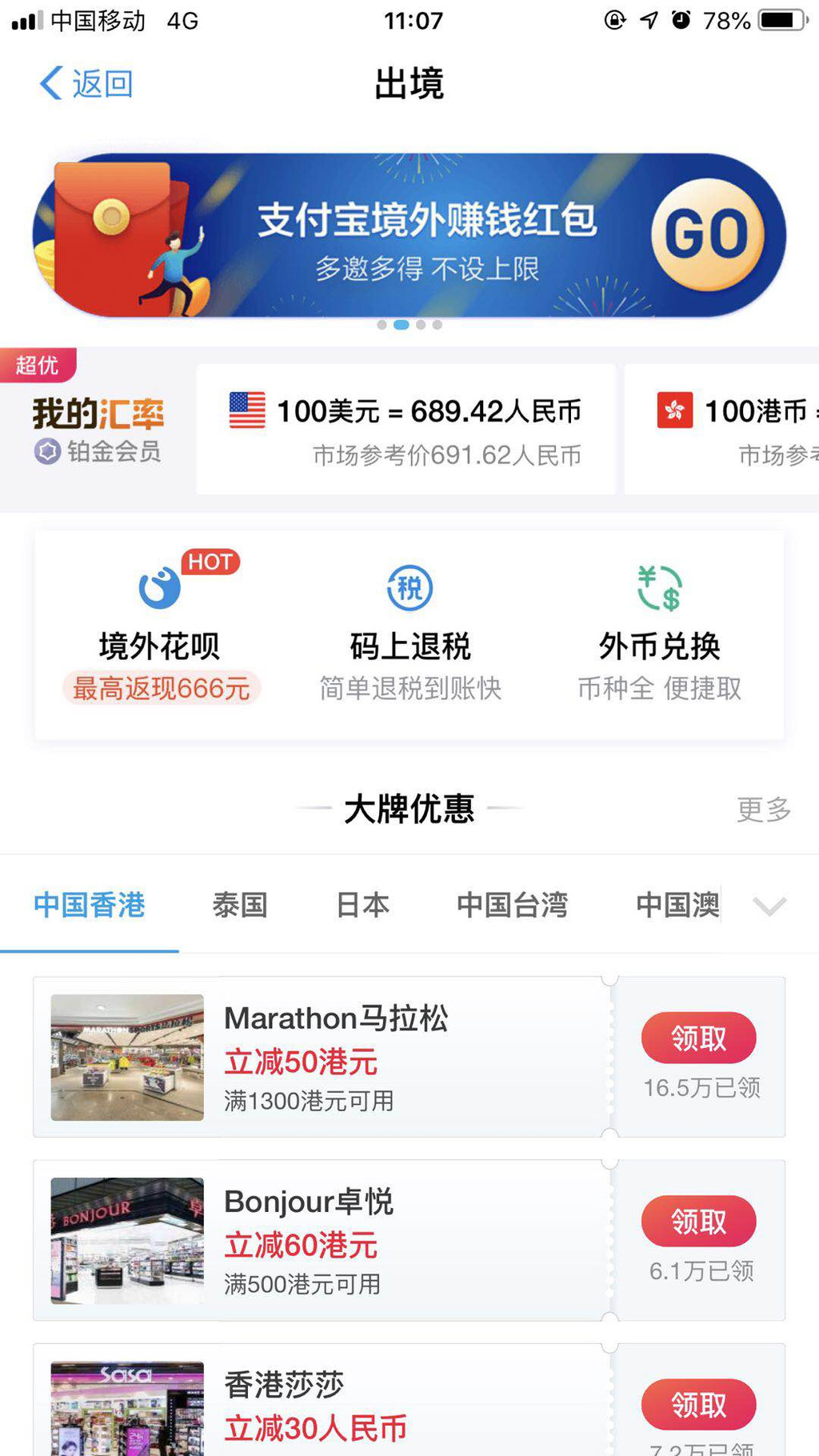 7、优惠活动&优惠券:建议在支付宝,搜索“出境”,然后选择香港,有很多店的优惠券可以领,还有出境红包可以领,还有一些出境支付活动可以参加,反正全部点一下肯定没错。我是支付宝铂金会员,先升级钻石汇率,支付宝支付有最优汇率。在大商场买东西建议刷卡或用支付宝,汇率最优。
