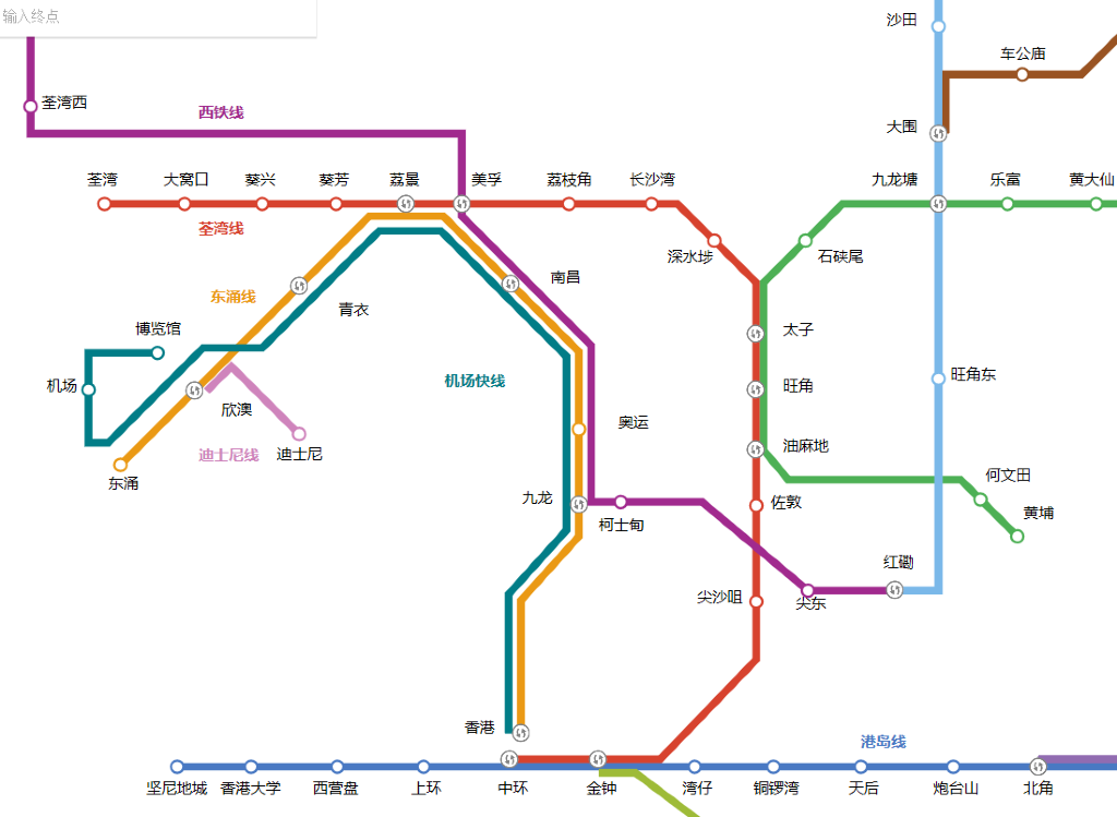 我是要去迪士尼,所以就去九龙站坐地铁啦~我是提前买好了八达通,直接刷卡通过就可以了,我老公没买就直接去机器买交通币,跟广州地铁操作一样啦。橙色东涌线(东涌方向):九龙站-》欣澳站-》迪士尼专线,通往迪士尼有专门车厢,非常可爱,都是米奇老鼠图案。