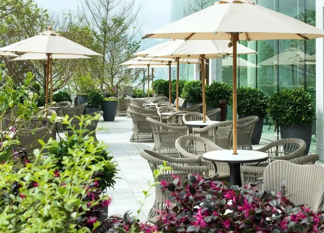 步入酒店大堂,即可通过高8米、宽80米的弧形玻璃幕墙欣赏到舒展开阔的维港海景。穿过大堂便是偌大的户外花园,处处栽种了修剪整齐的茂密树丛,在城市中心,能享受到这样大片的绿,是非常奢侈的一件事。