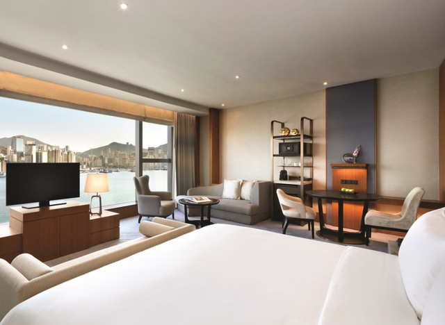 酒店拥有546间客房,其中超过6成的客房可以欣赏享有维多利亚港及港岛海岸线景致,每间房均用上落地玻璃窗户,让客人欣赏醉人的市景或海景,而且客房面积从最小42平方米至294平方米的总统套房。