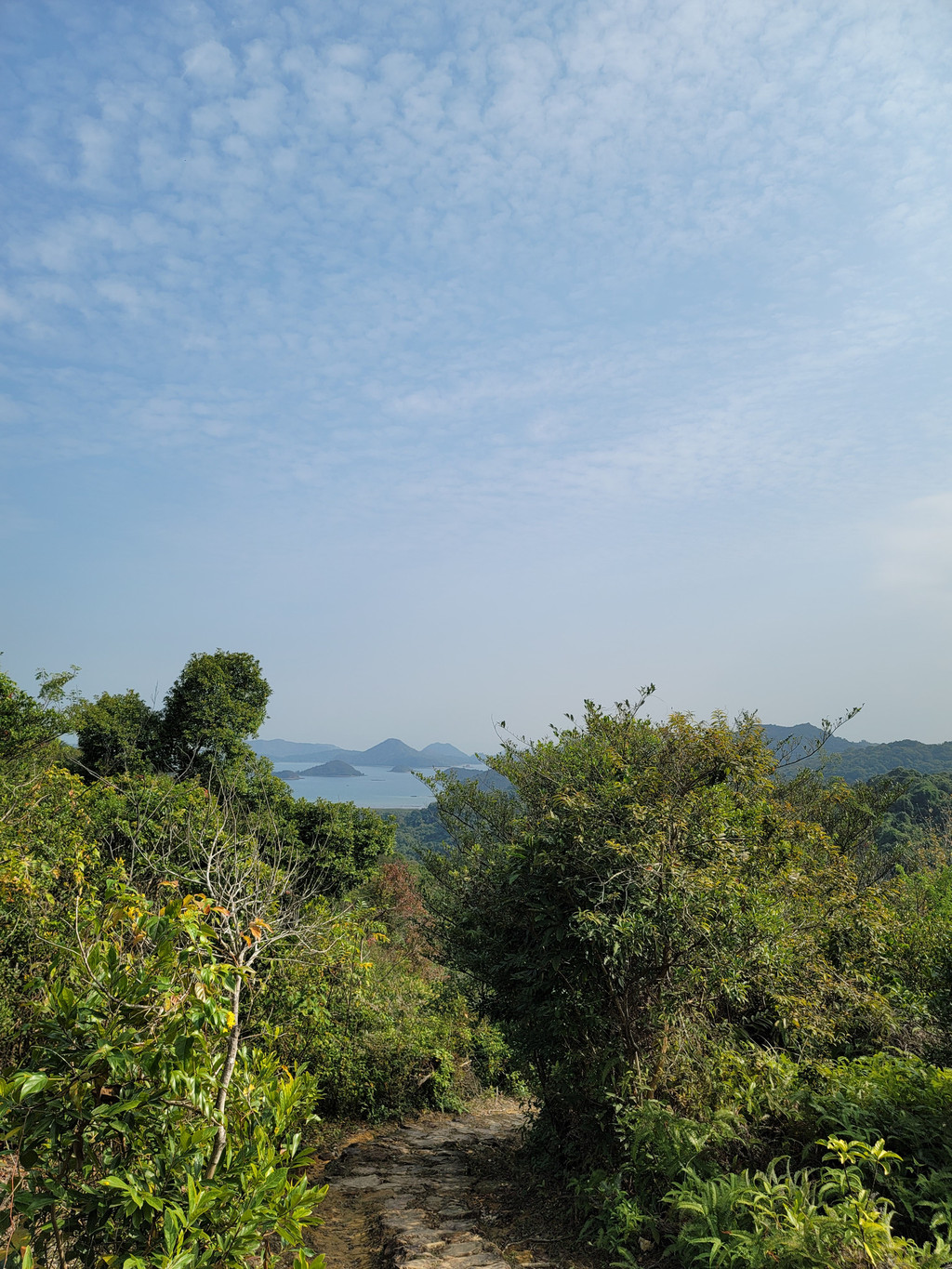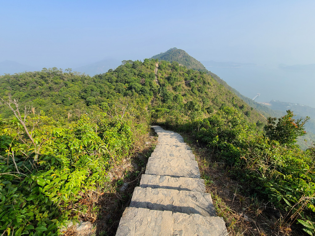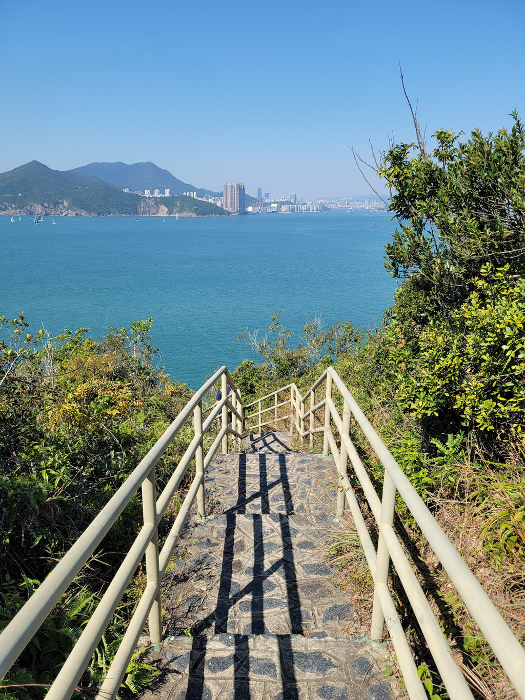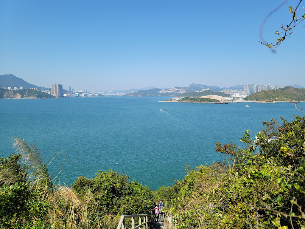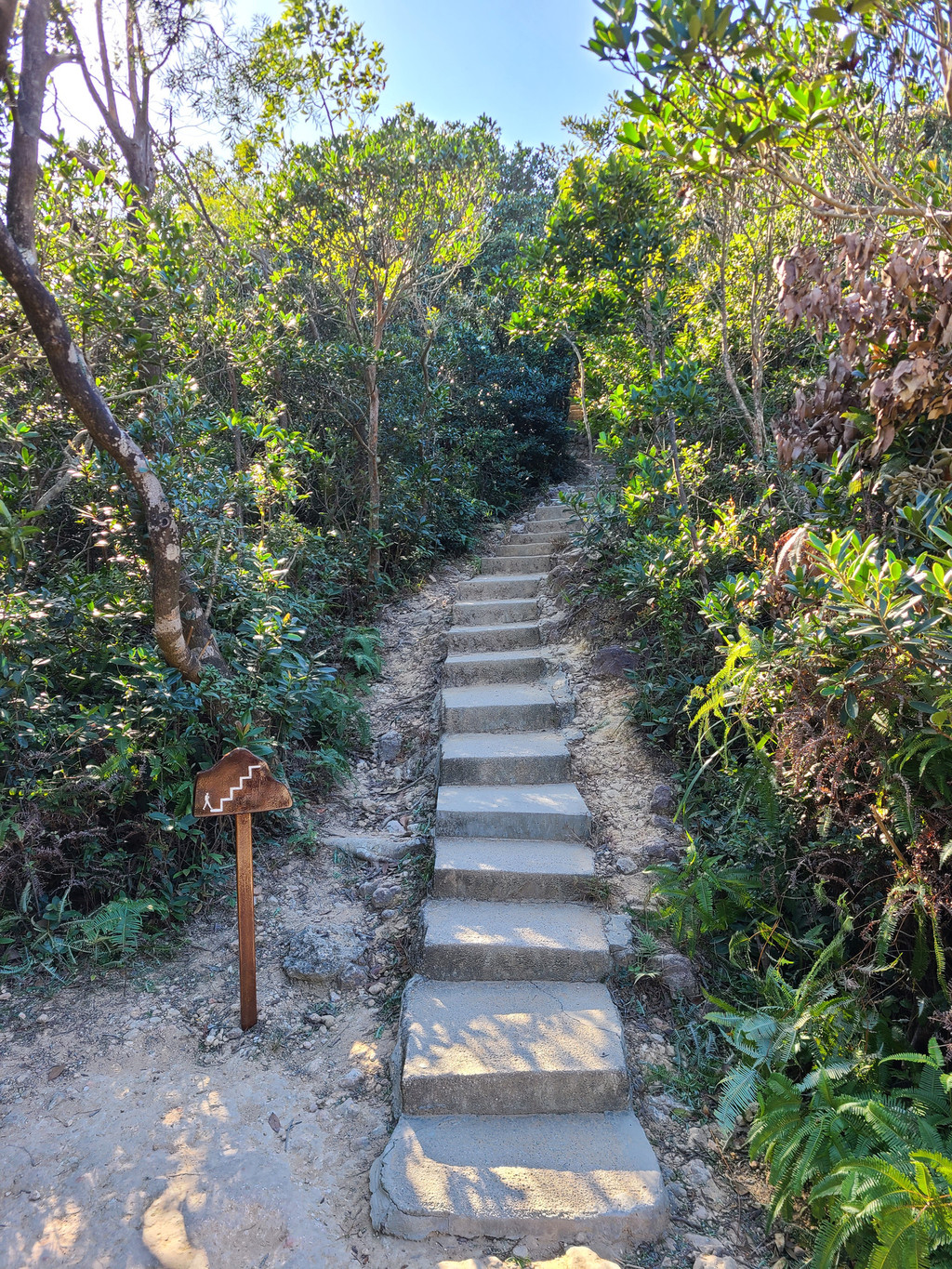 走完只是上坡的龙跃径,到达清风坳,就会有一段近千级的石阶,需要不停攀登,如果埋头赶路,可能是乏味的,但是这段路,不时回看就可以从树木之间俯瞰到小西湾和将军澳之间的海景,途中还在一个观景平台,可以借助景色减低疲劳,登尽石阶后,被山环抱于海面的歌连臣角,算是一道开胃菜。
