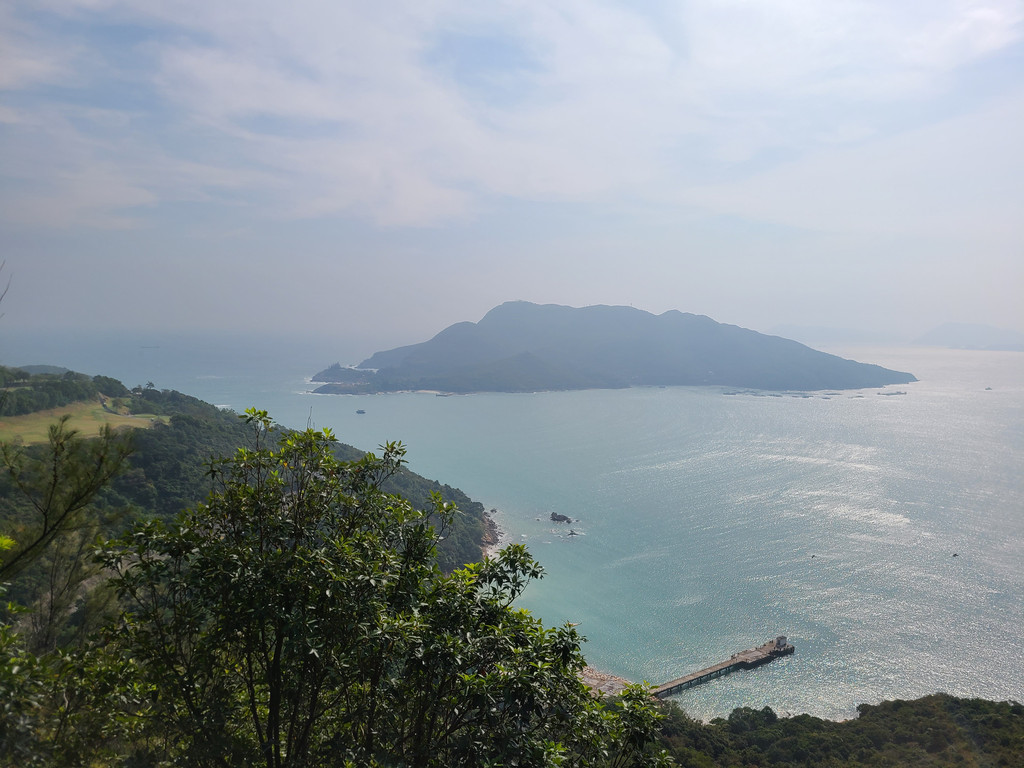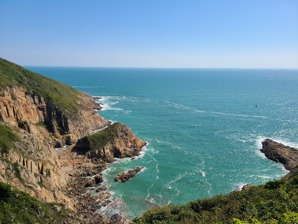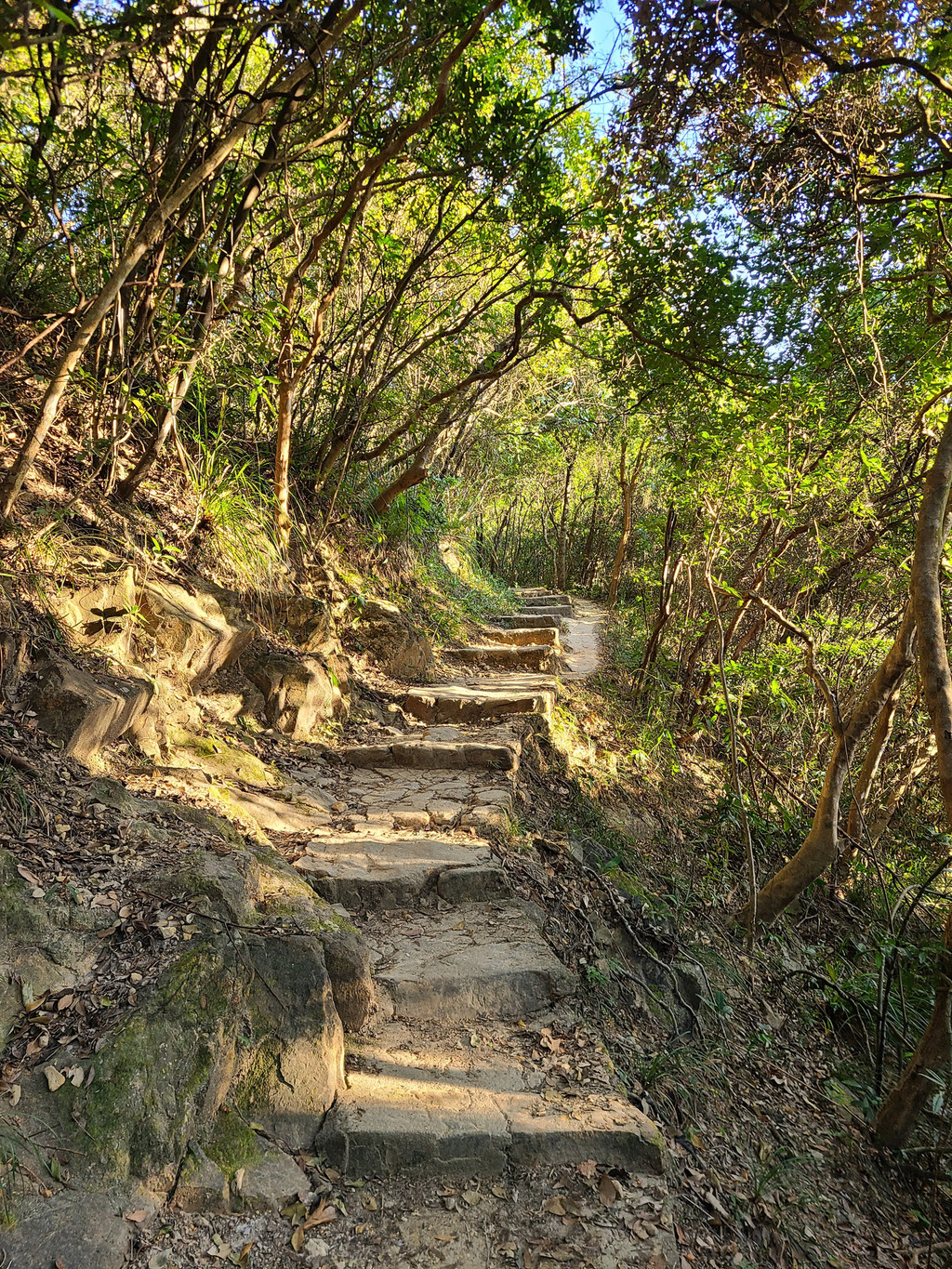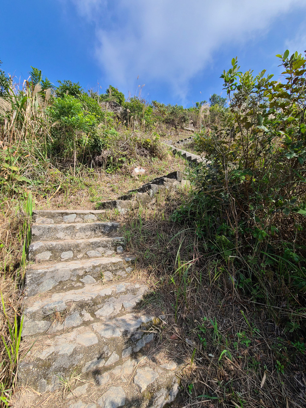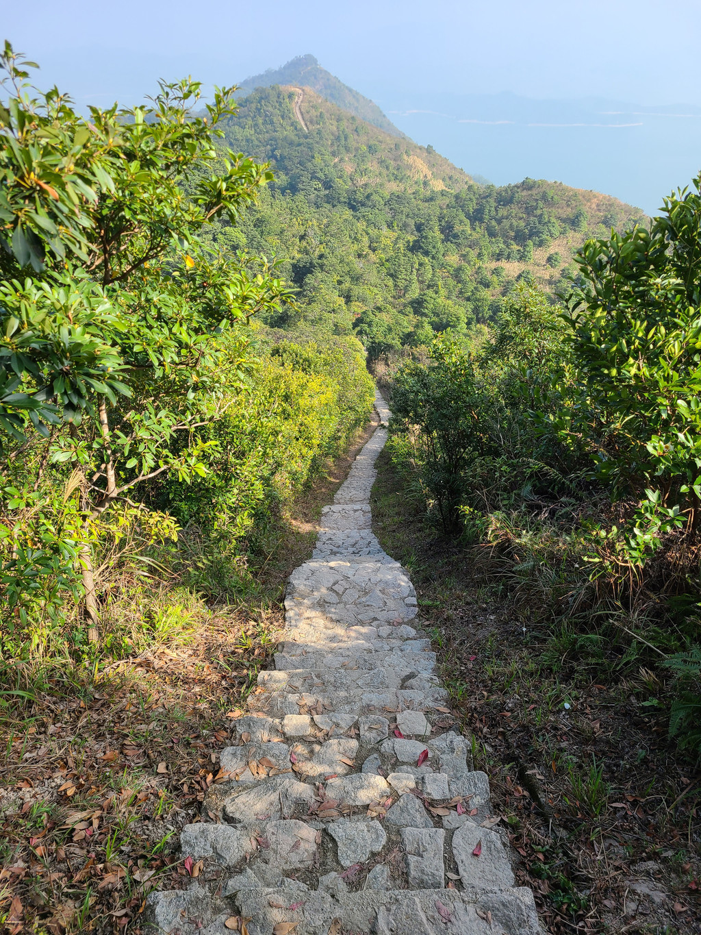 走完只是上坡的龙跃径,到达清风坳,就会有一段近千级的石阶,需要不停攀登,如果埋头赶路,可能是乏味的,但是这段路,不时回看就可以从树木之间俯瞰到小西湾和将军澳之间的海景,途中还在一个观景平台,可以借助景色减低疲劳,登尽石阶后,被山环抱于海面的歌连臣角,算是一道开胃菜。