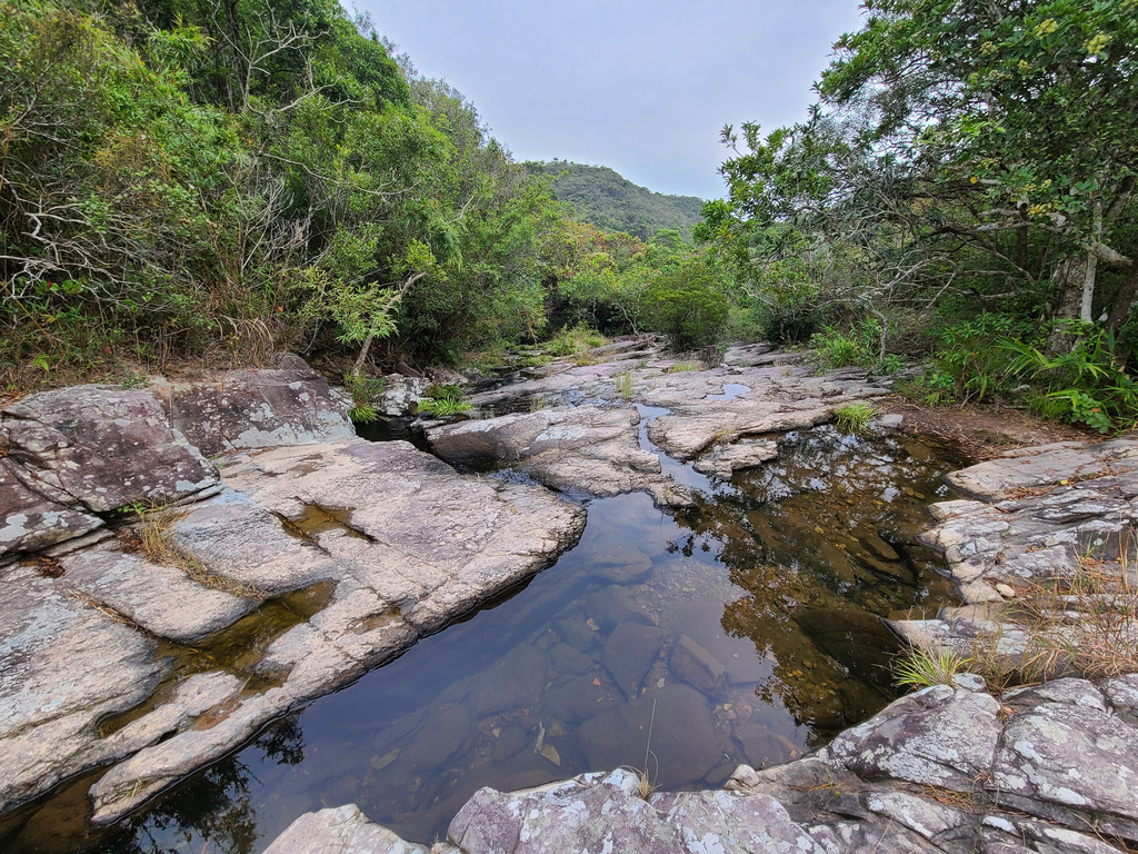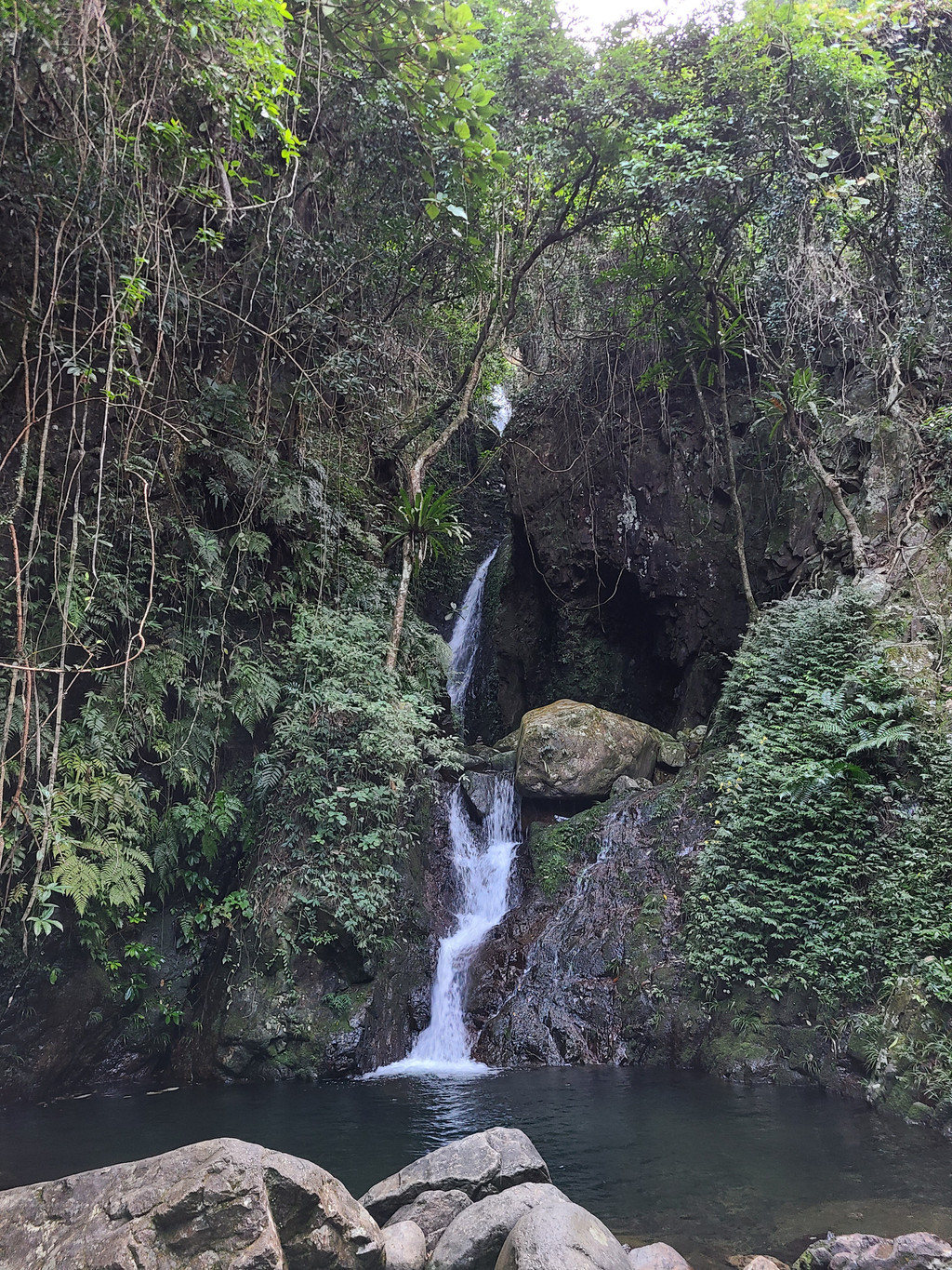 所幸此时距离井底瀑已经不远,在山路上要往下有一小段才能看到被树木和岩石包围的瀑布,要在潭水的左侧才能看到这个其实是由三层水流组成的瀑布。