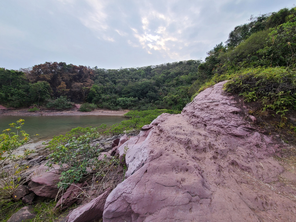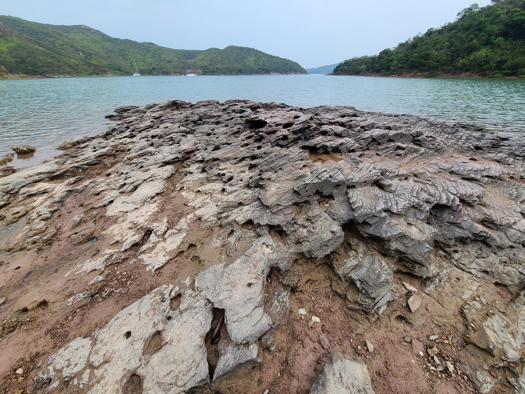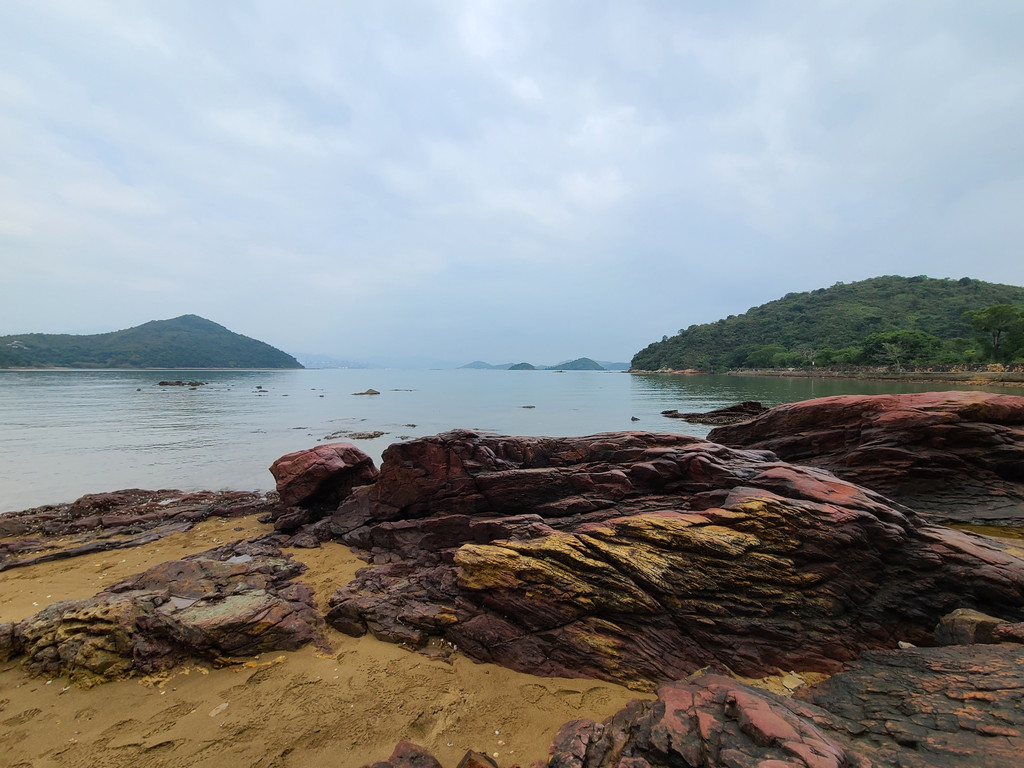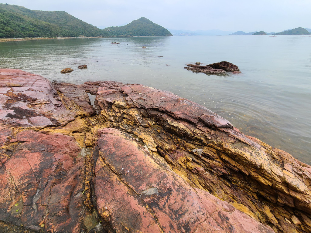 之后的道路上还是有很多惊喜,虽然这段荔枝窝到三桠村的道路,沿海行走的地方不多,不过还是有很多独特的地质地貌可以体验得到。这里有很多红色的沉积岩,这些红色砂岩、砾岩和角砾岩所组成,属白垩纪晚期的红层,与丹霞地貌同属一类,其赤红颜色是当时气候干燥,岩石中铁质发生氧化作用的结果。新生代以来,由于构造沉降、海平面上升,使这里形成海湾相连,众岛环抱的内海环境。整个新界东北部海岸,或多或少都有着这样的红色踪迹。