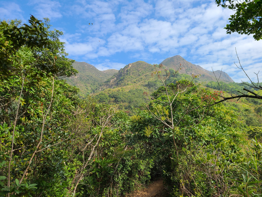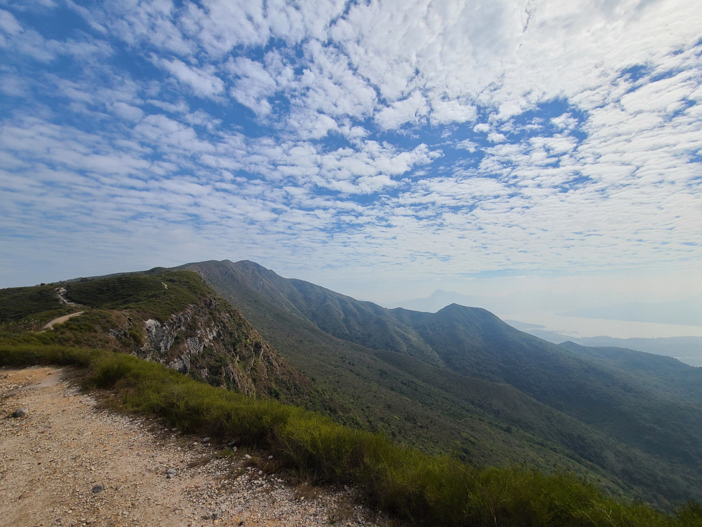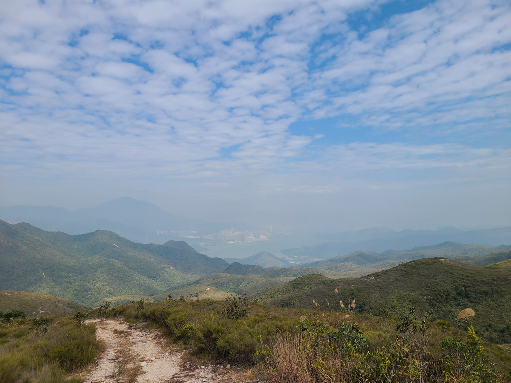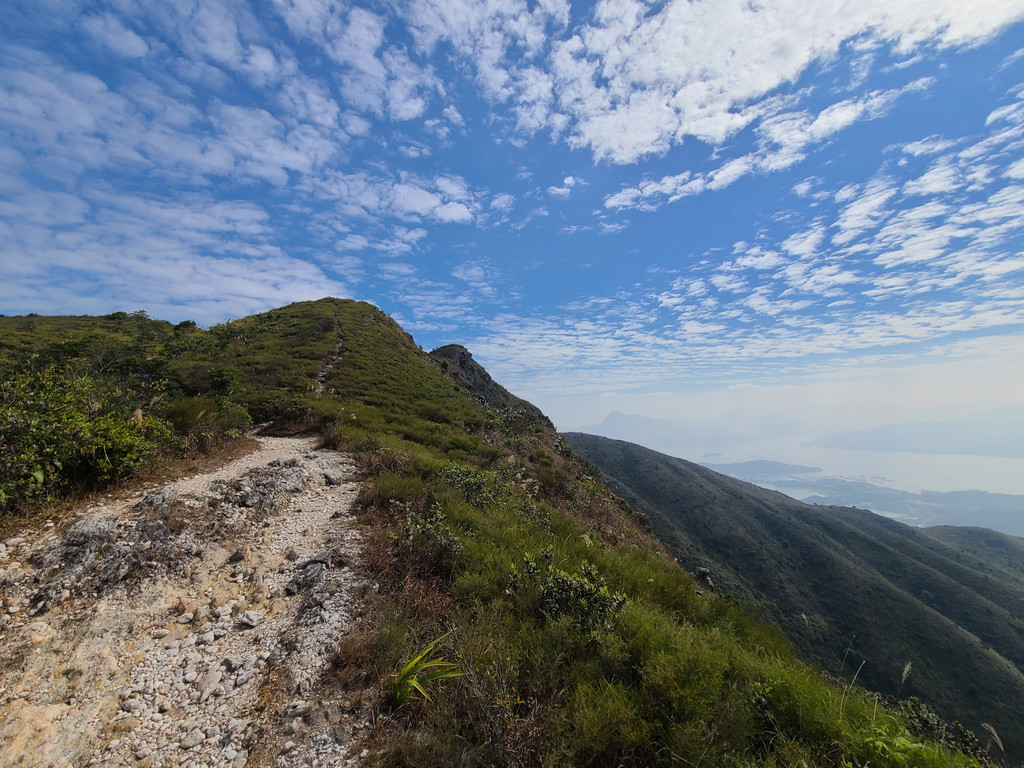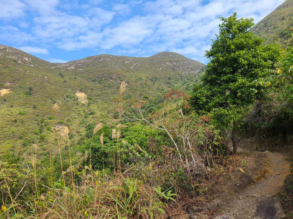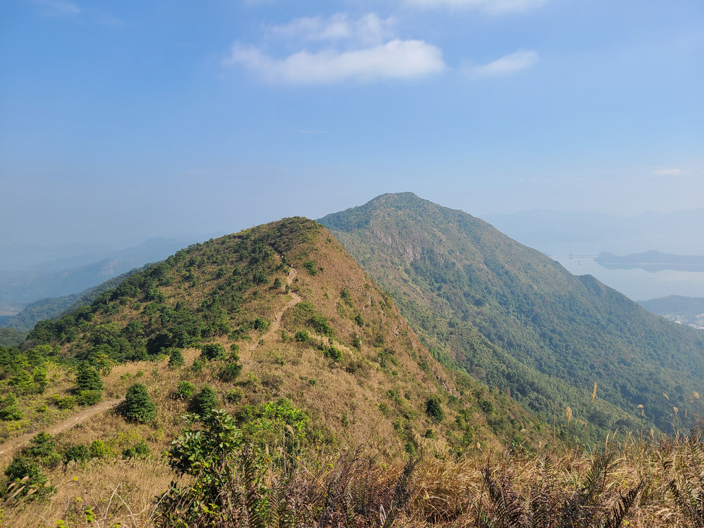 这时偶遇正在修整道路的工人,我们只是背着装了几瓶水的背包,那段登山的路途已经挥汗如雨,这些工人还需要每天带着工具登山并顶着风吹日晒而工作,他们是令这座充满山地的亚洲国际都会能同时拥有这么多的高楼大厦和徒步径的幕后功臣。这一段山脊路途,景色很好,向北可以远眺沙头角和盐田,向南是一片仿如瑞士冰川般的四面环山谷地,当然香港不会有冰川峡谷,高差也没有那么巨大,不过这里还是能给人一种壮阔的感觉。