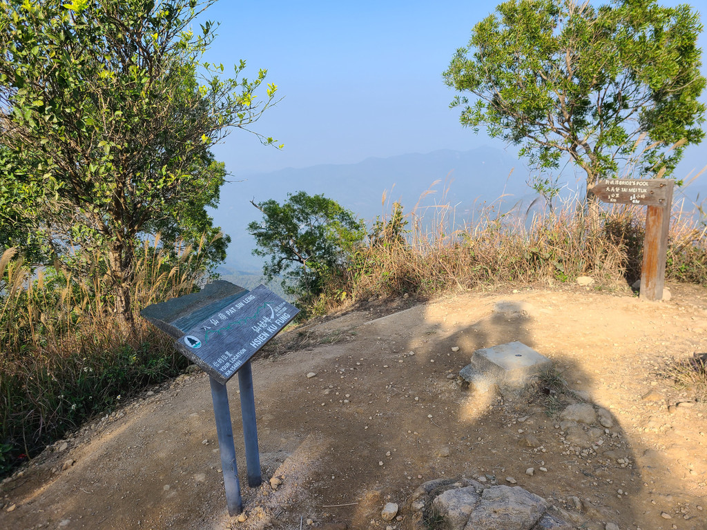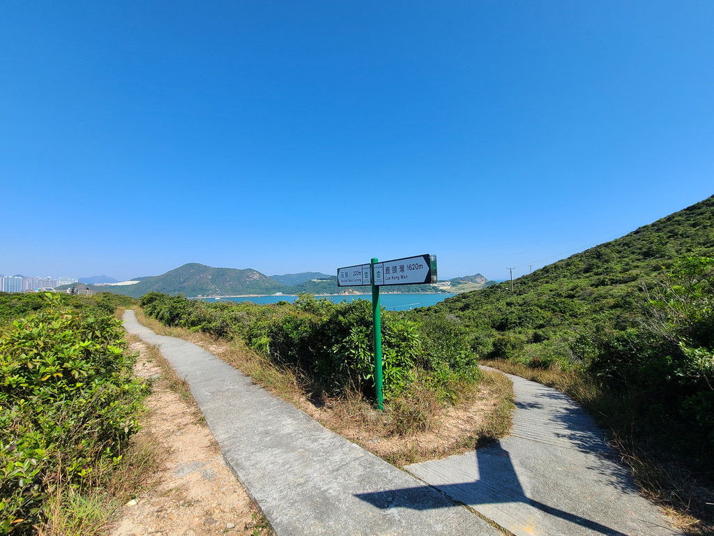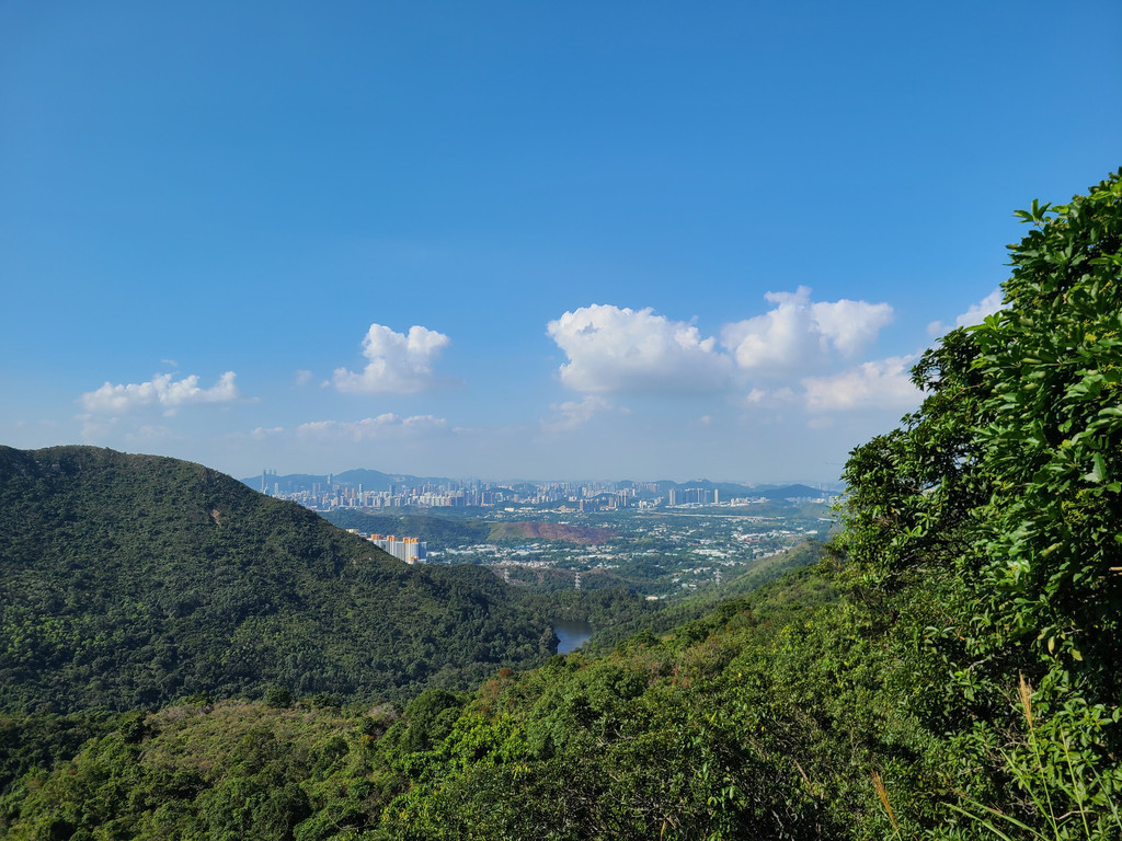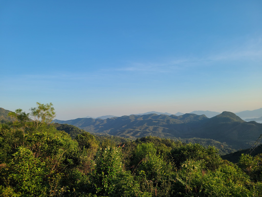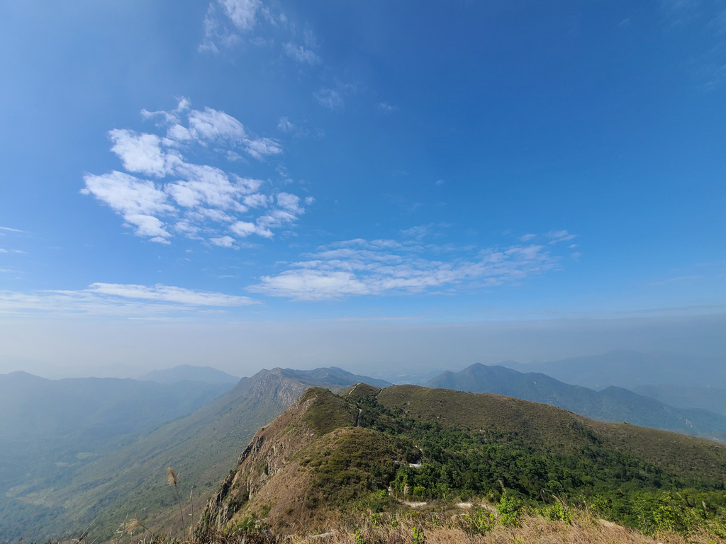 这时偶遇正在修整道路的工人,我们只是背着装了几瓶水的背包,那段登山的路途已经挥汗如雨,这些工人还需要每天带着工具登山并顶着风吹日晒而工作,他们是令这座充满山地的亚洲国际都会能同时拥有这么多的高楼大厦和徒步径的幕后功臣。这一段山脊路途,景色很好,向北可以远眺沙头角和盐田,向南是一片仿如瑞士冰川般的四面环山谷地,当然香港不会有冰川峡谷,高差也没有那么巨大,不过这里还是能给人一种壮阔的感觉。