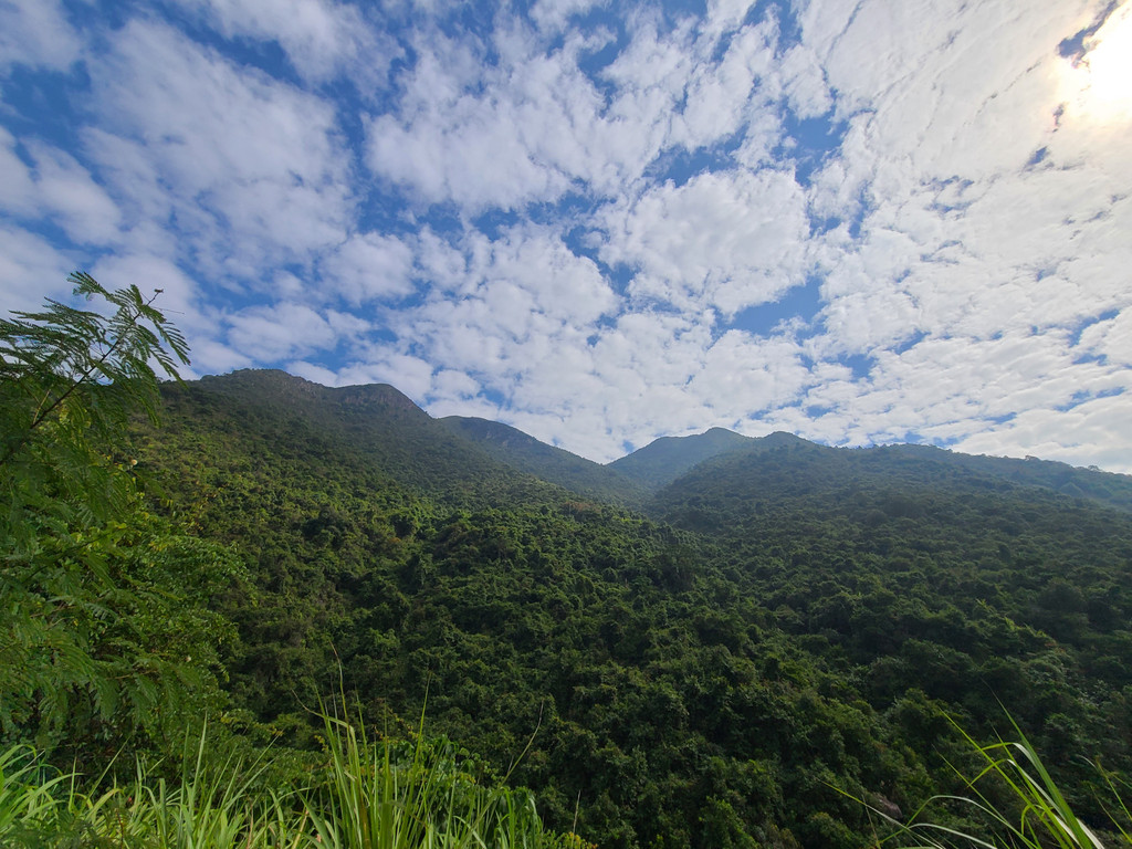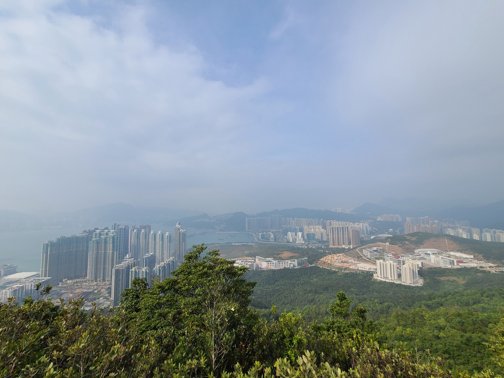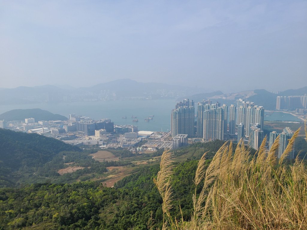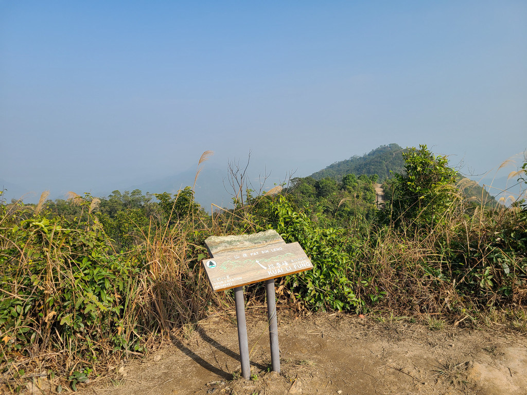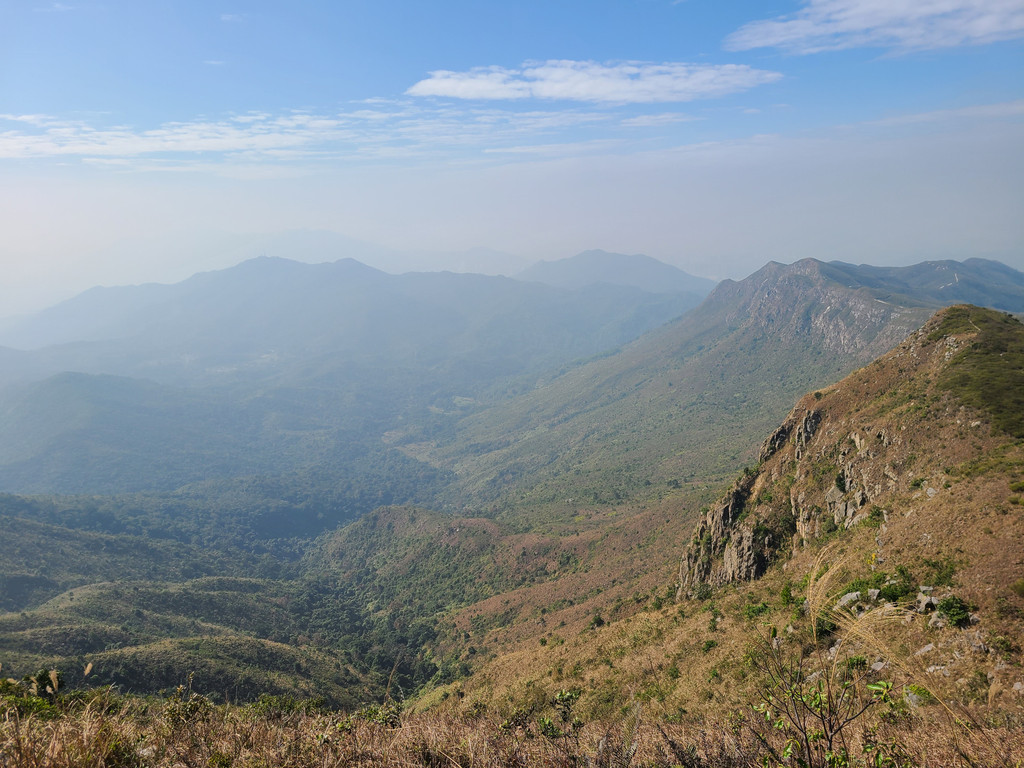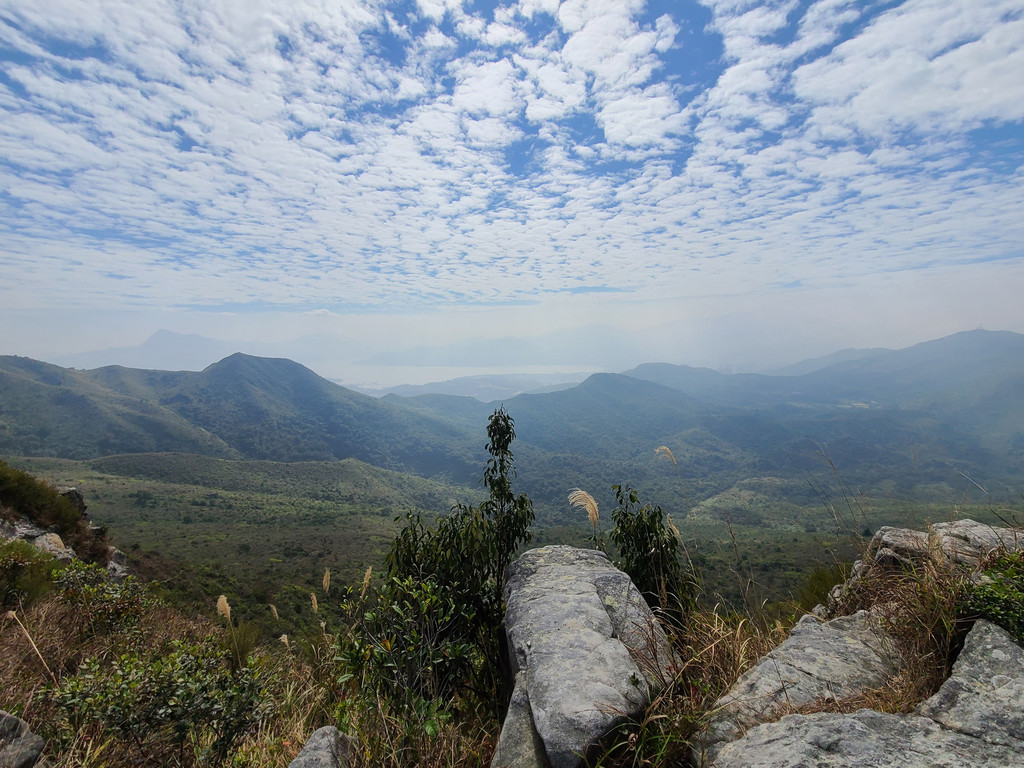 这时偶遇正在修整道路的工人,我们只是背着装了几瓶水的背包,那段登山的路途已经挥汗如雨,这些工人还需要每天带着工具登山并顶着风吹日晒而工作,他们是令这座充满山地的亚洲国际都会能同时拥有这么多的高楼大厦和徒步径的幕后功臣。这一段山脊路途,景色很好,向北可以远眺沙头角和盐田,向南是一片仿如瑞士冰川般的四面环山谷地,当然香港不会有冰川峡谷,高差也没有那么巨大,不过这里还是能给人一种壮阔的感觉。