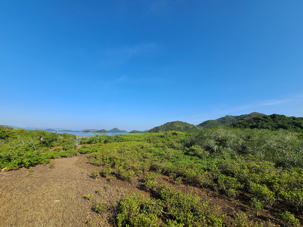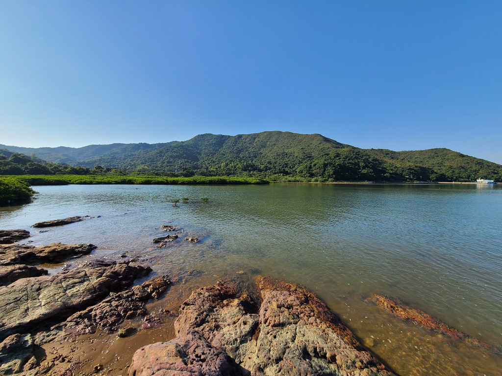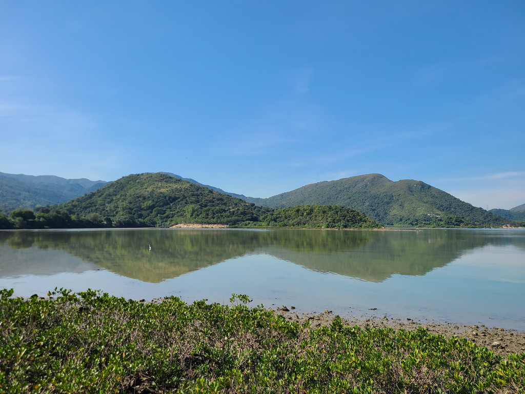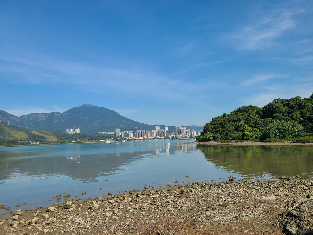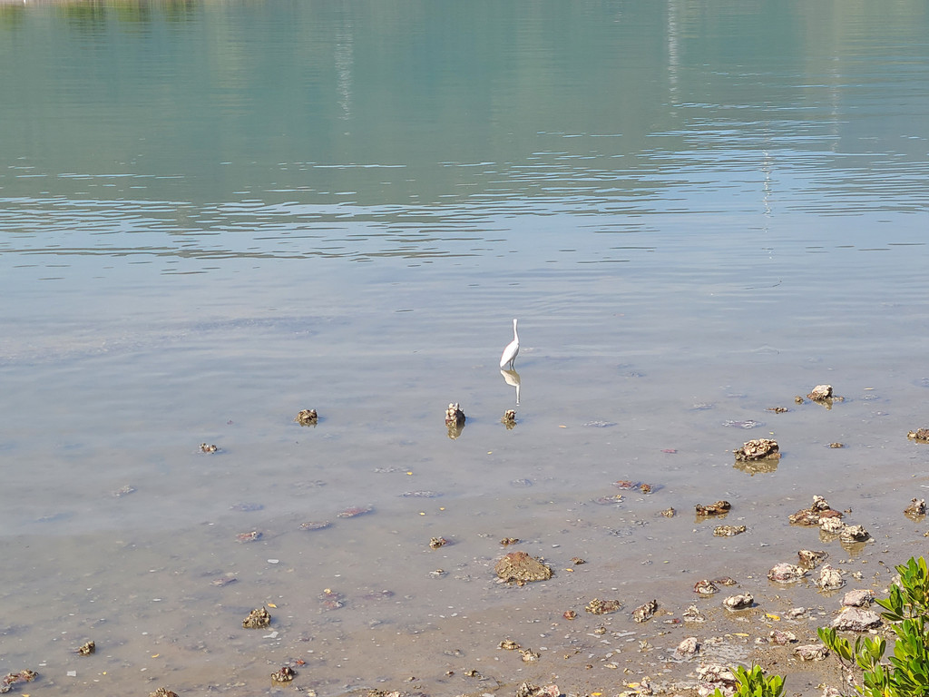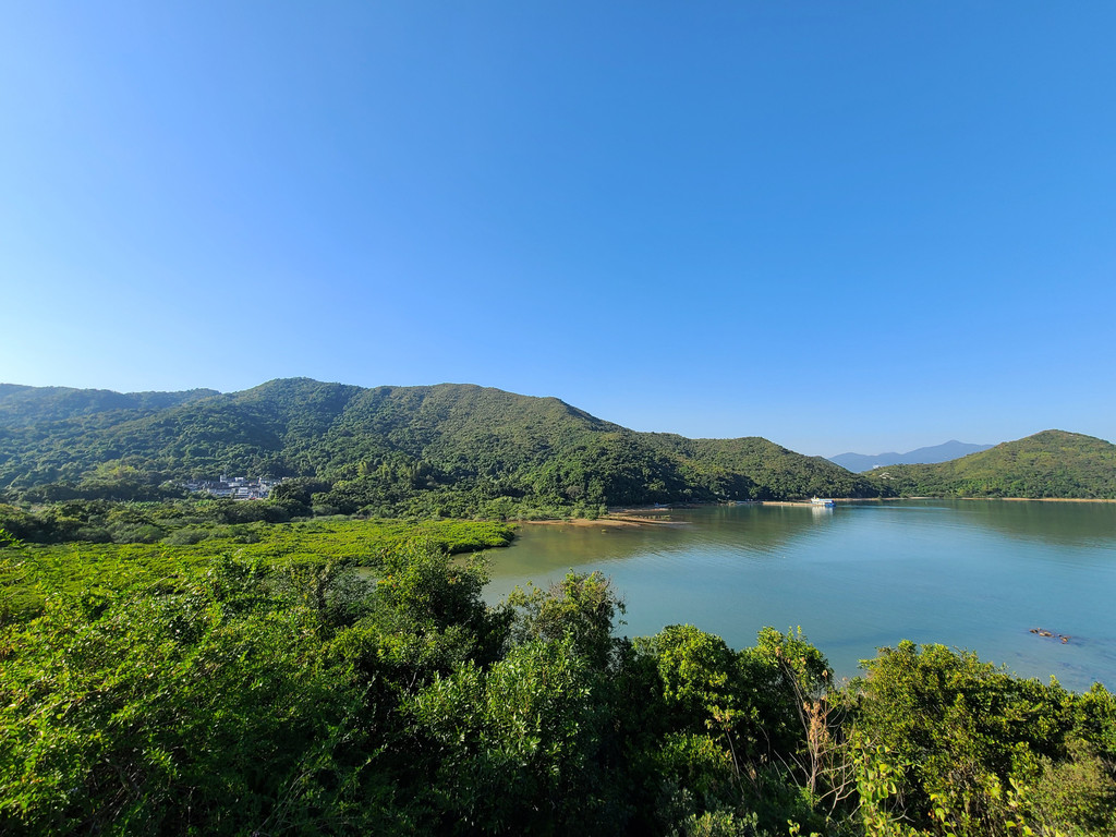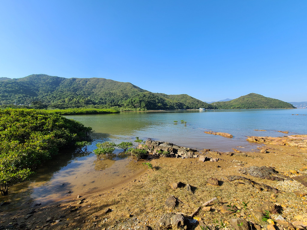 沿海边有不少的红树林滩涂,不过远范围最大的还是荔枝窝的红树林, 而且有步道设置在红树林中,可以近观这些滩涂的生态。没有太多红树林的地方,不时有海鸟在觅食,和波纹轻轻的海水形成美丽的倒影。好不容易走过荔枝窝的红树林,有一个观景台,登高便可以饱览整个海湾景致。
