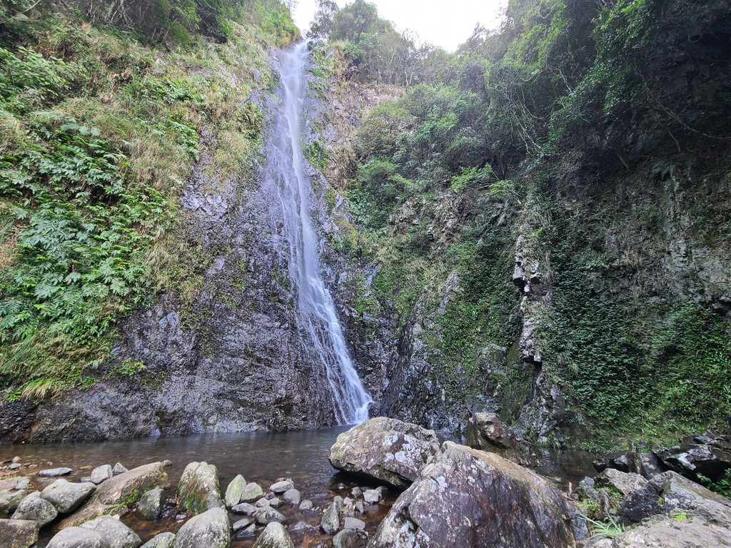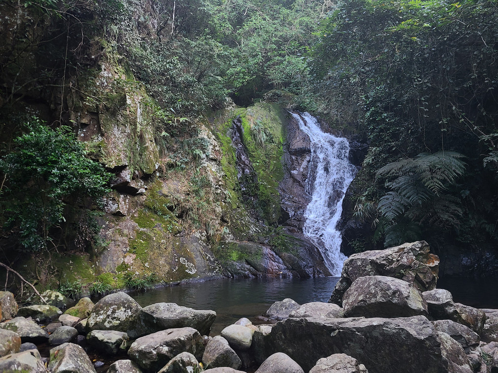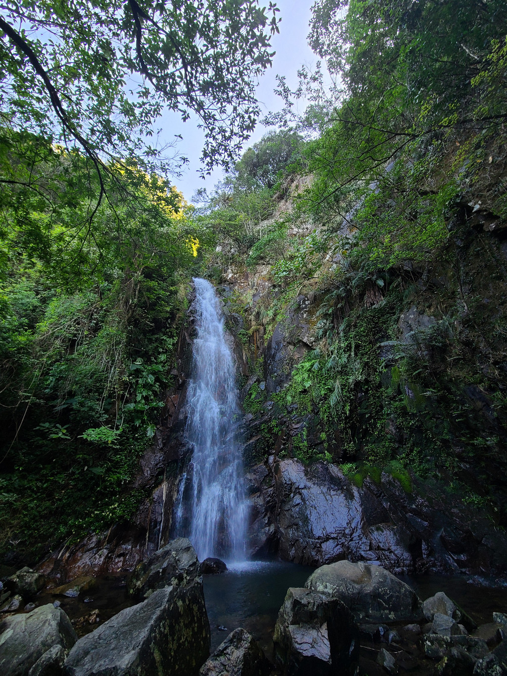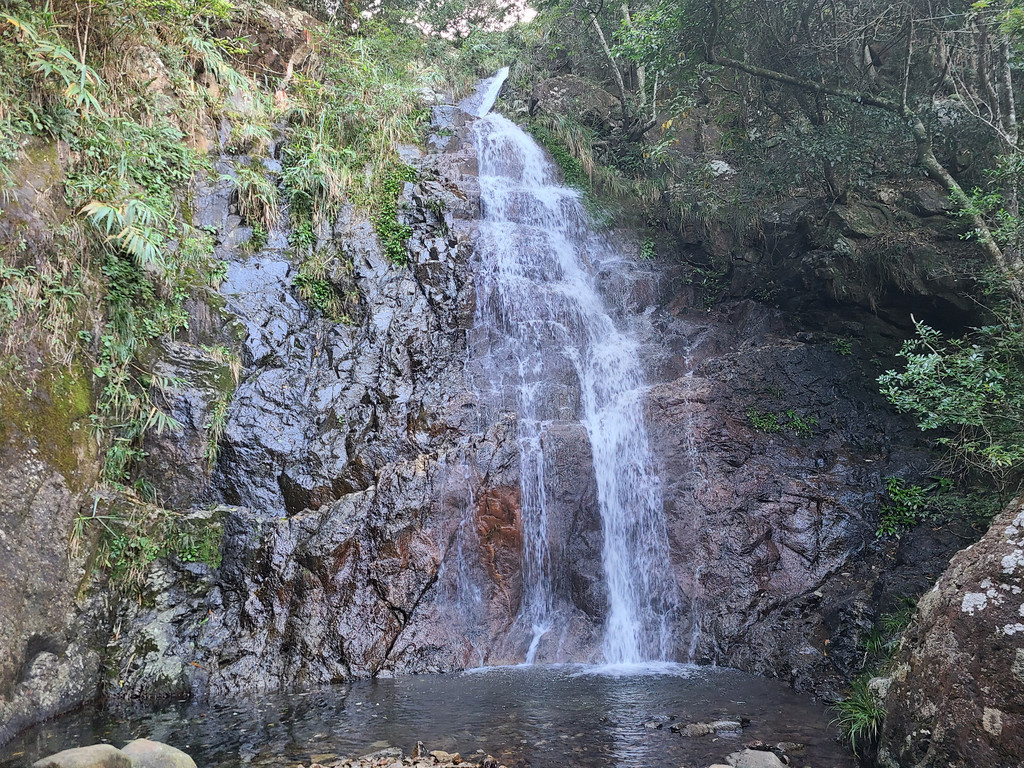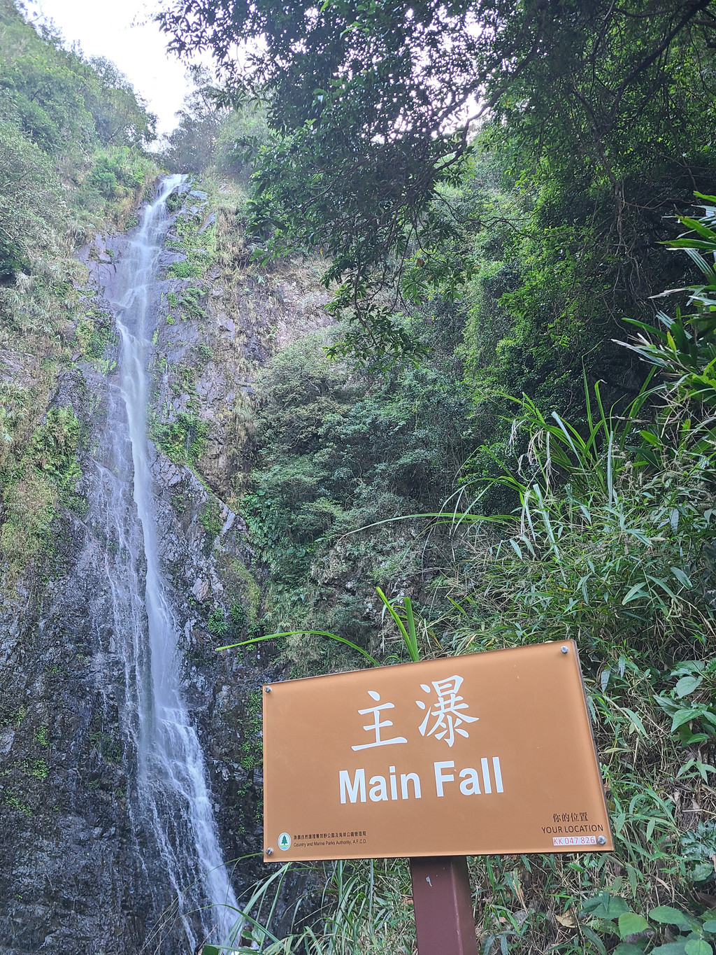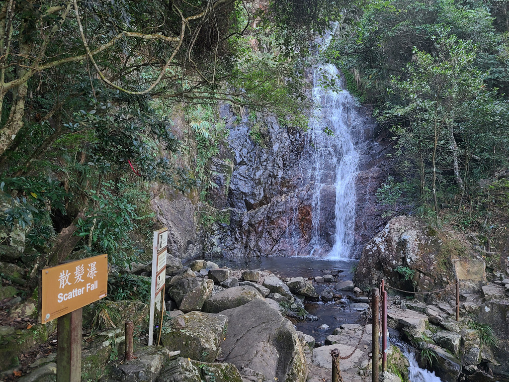 走走停停,终于到达这个香港最长的瀑布,对于最高点不足千米的香港,着实是难得的,而且在深秋时节,水量而不算少,不过由于高差,水流显得修长,潭水旁的石头或多或少都被高处落下的水湿润了,变得湿滑。