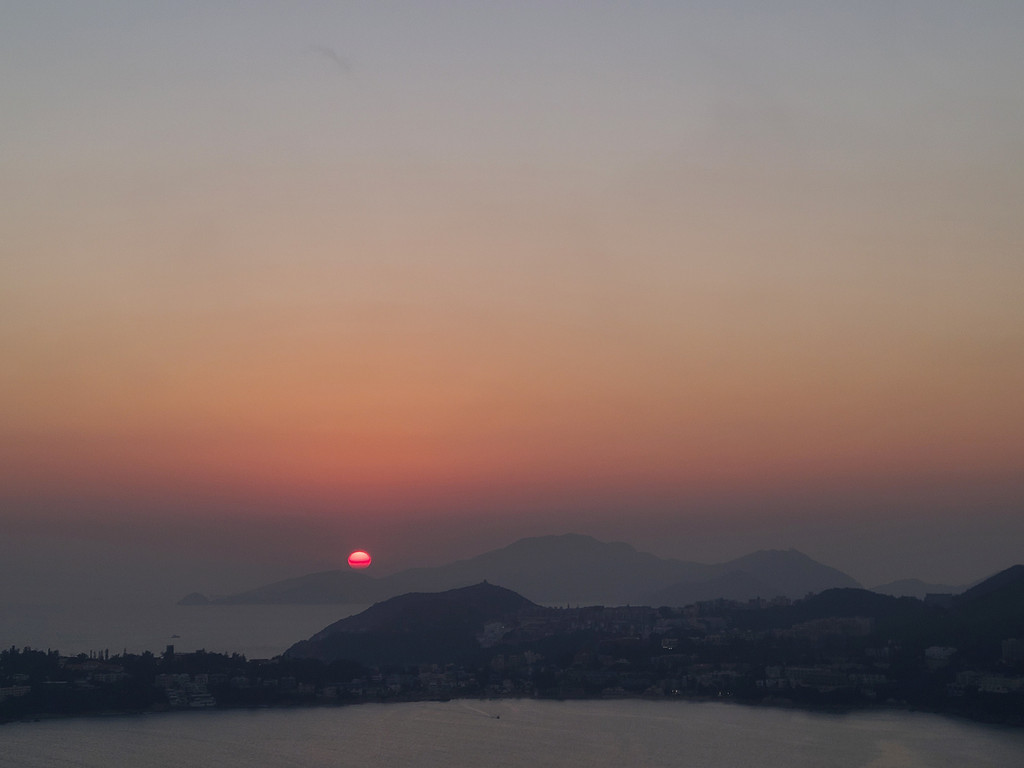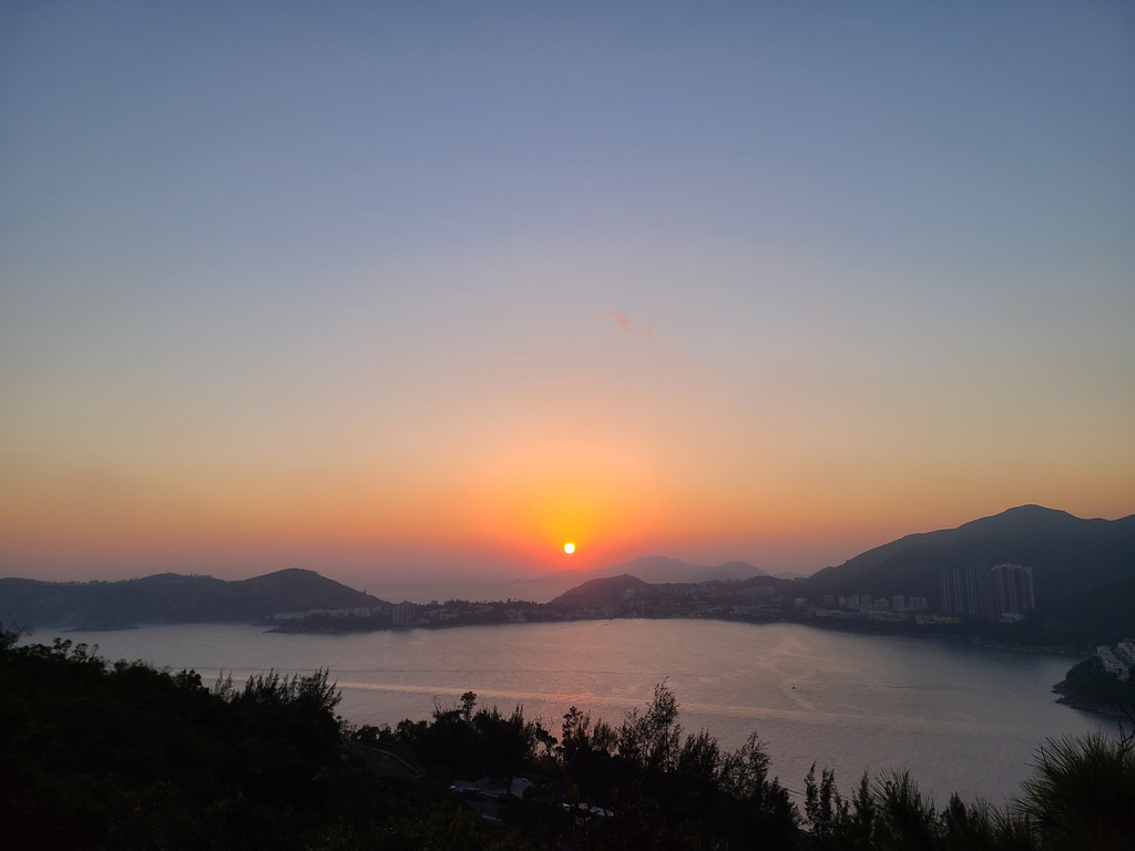 太阳越来越西下,反而令缺少植被的路面似乎镀上了一层金黄。渐行渐近山脚的石澳道,又近黄昏时分,我们决定又等一次日落。看着太阳从耀眼到沉没山海之间,总会震撼于大自然的美景与神奇,只可惜今日几乎万里无云,反令这夕阳之景缺少了华美的谢幕。