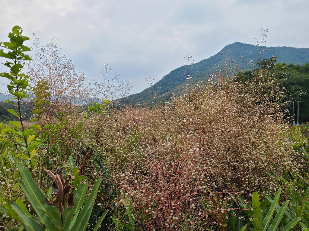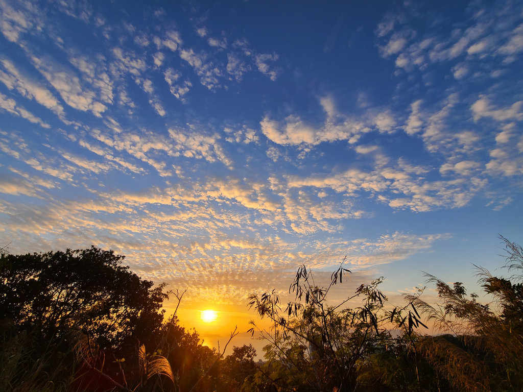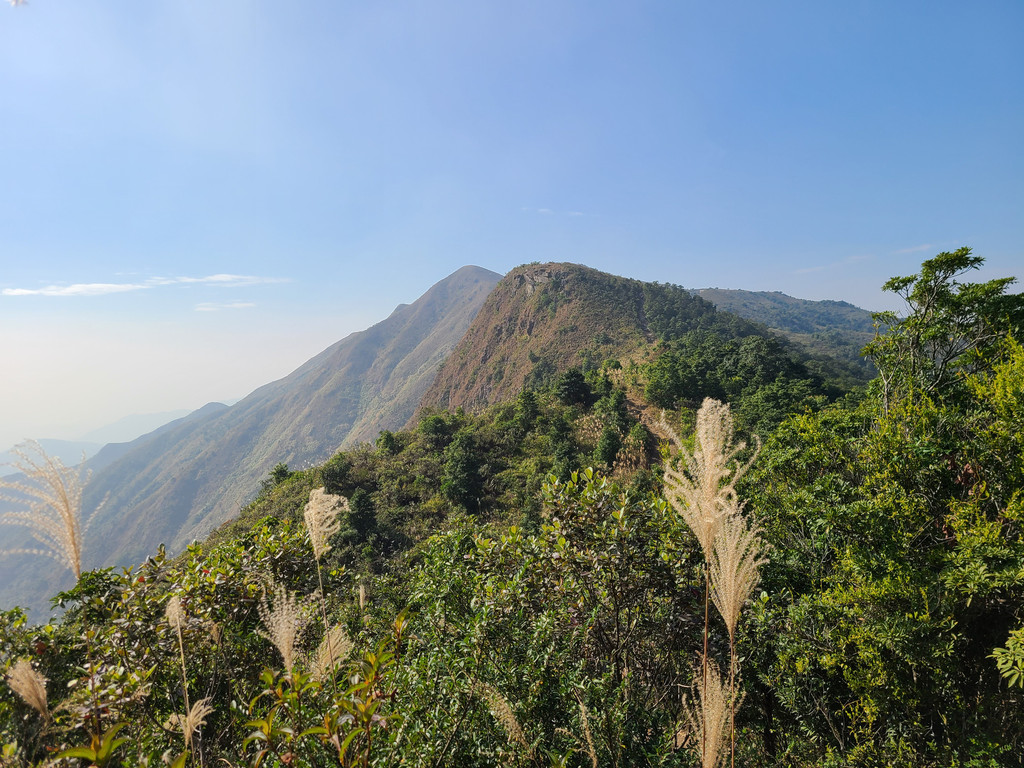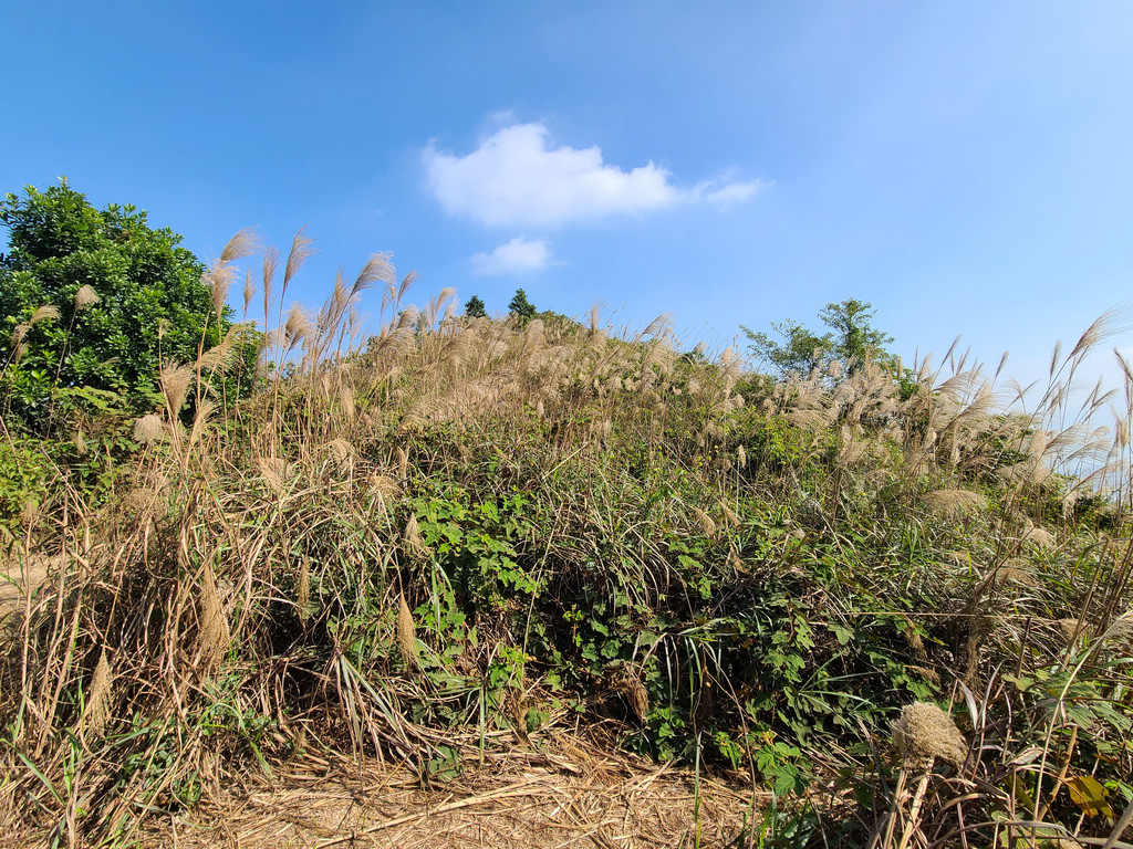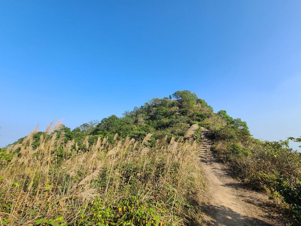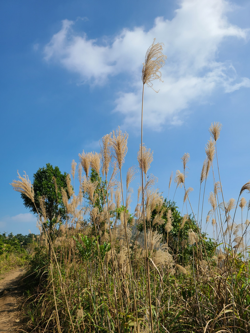 登上黄岭的山顶,船湾海和船湾淡水湖尽收眼底,只是略微可惜,天边的雾气弥漫,令景色模糊了。越过下降近百米的犁壁山,这一路有多处的芒草散落地,虽然密集度不够,不过背景的山和天补完了。