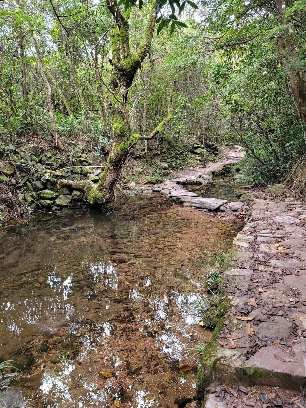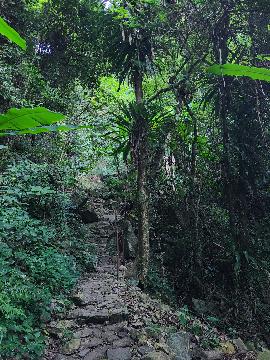 开始阶段,几乎全程都是沿石级而上,石级并不规则,有些还很窄,仅够一人通过,而且很多拐弯,拐弯处的一旁便是陡峭山壁。一开始上山,密林之中没有多少景致,只能听到流水声响,近半小时都是石阶,几乎消耗掉所有体力。