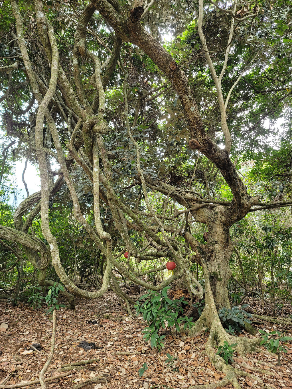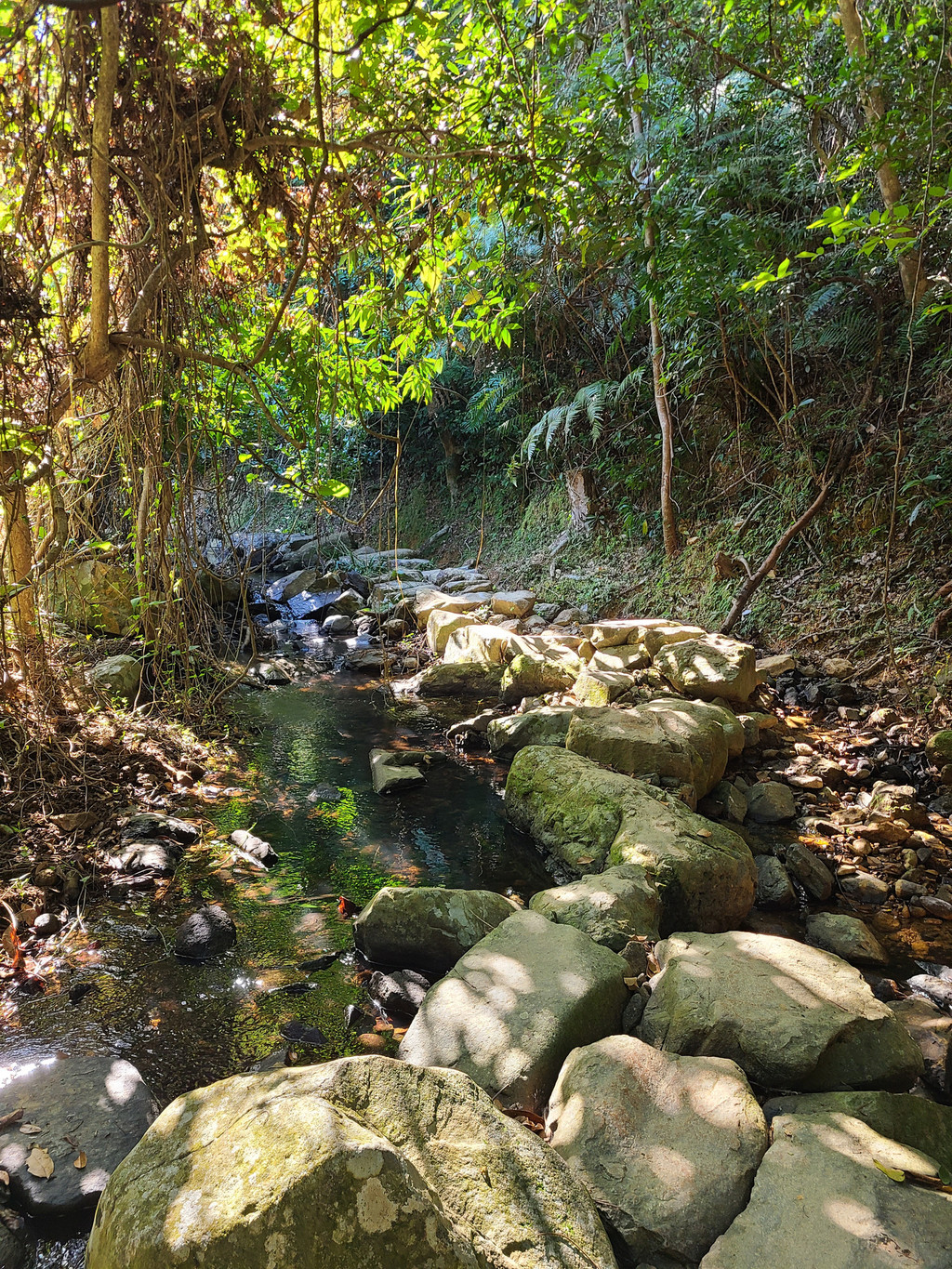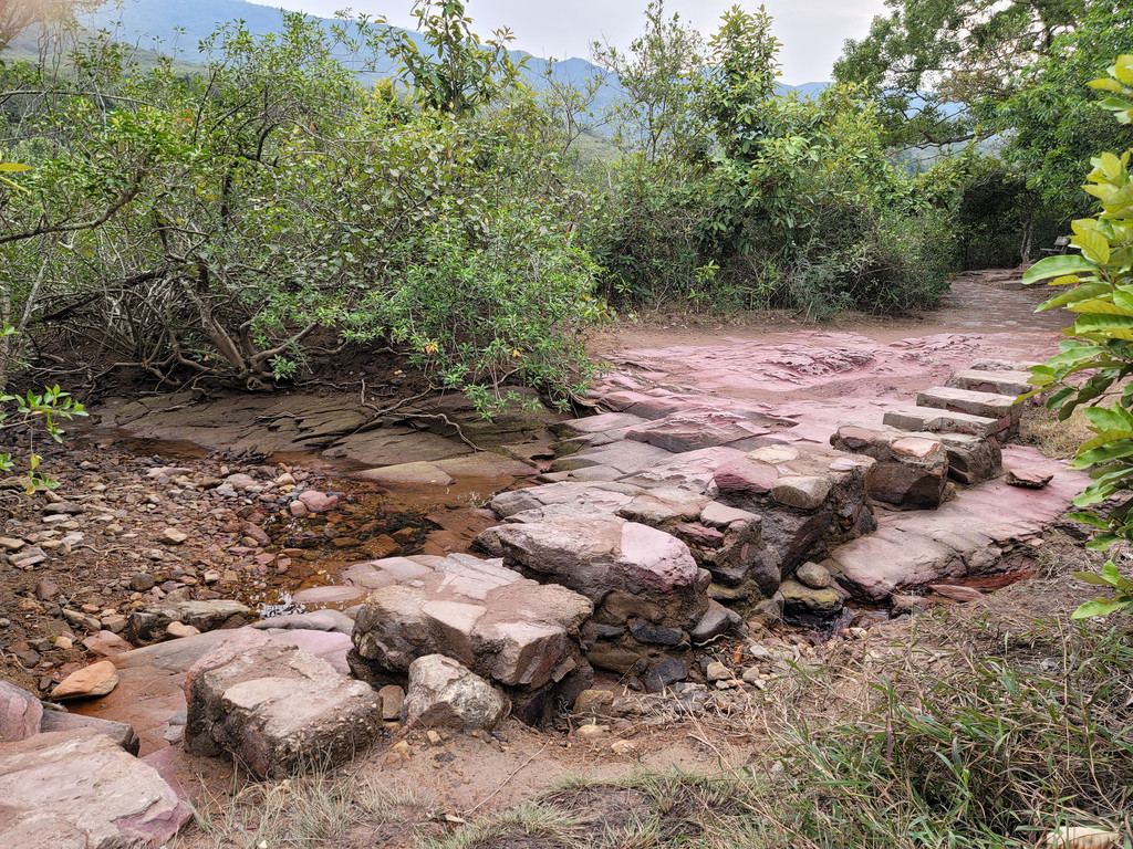 在这些红树林和红色沉积岩中行走,虽然海边路段不多,也是充满乐趣的,经过三桠涌营地之后,路开始进入树林之中,但是整段路还是比较平缓,所以走得很舒服,特别是呼吸着树木之中充沛的负离子氧气,而且路边还有苗三石涧,时不时会听到溪流的水在山石间流淌的声音,甚是悦耳。这段路还会经过两个淹没在树林之中的村庄,上苗田和下苗田,20世纪六七十年代,村民都搬迁之后,原来的房屋就渐渐被树木覆盖,行走在曾经的村道上,已经找不到房屋的痕迹。