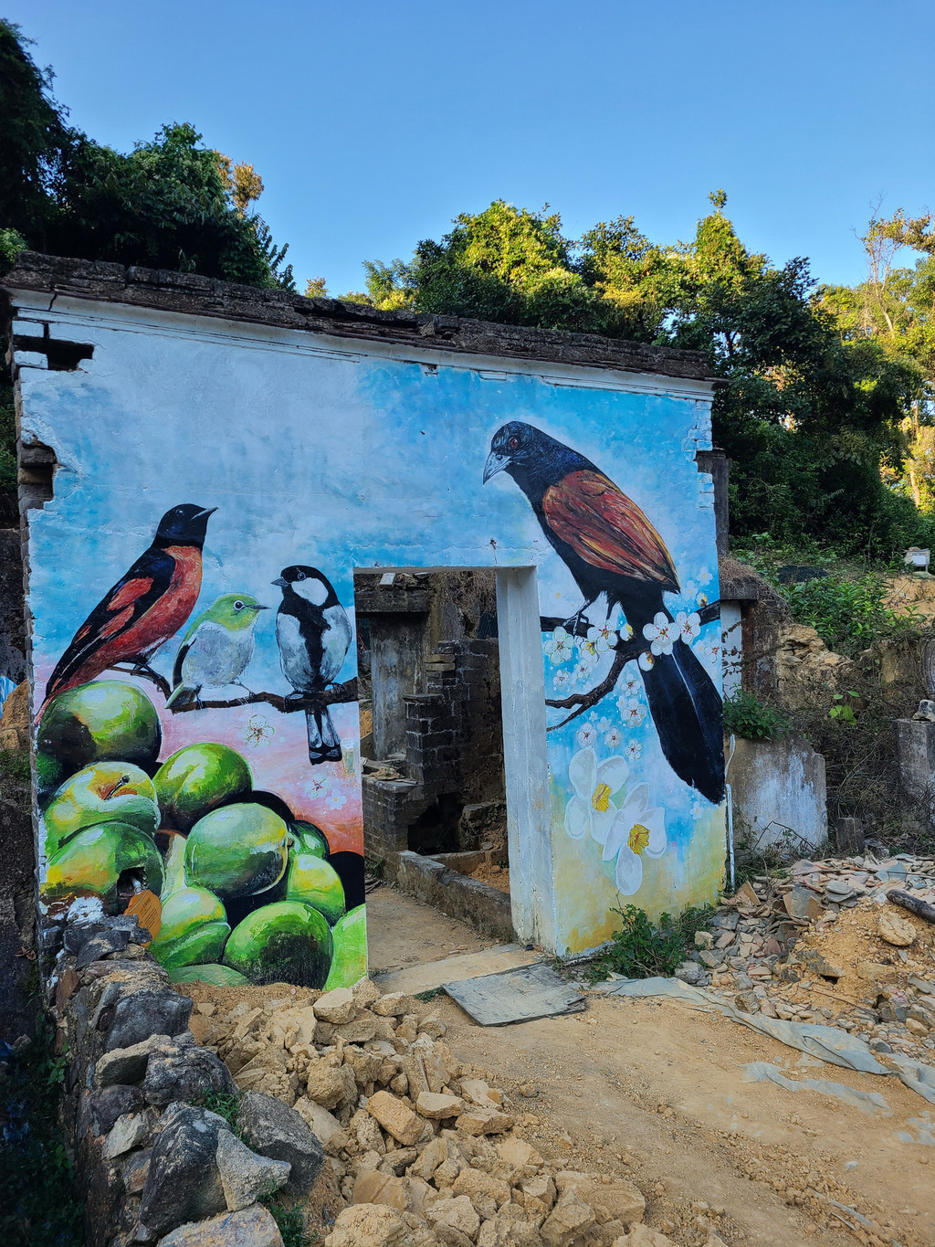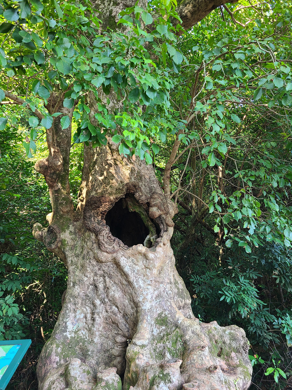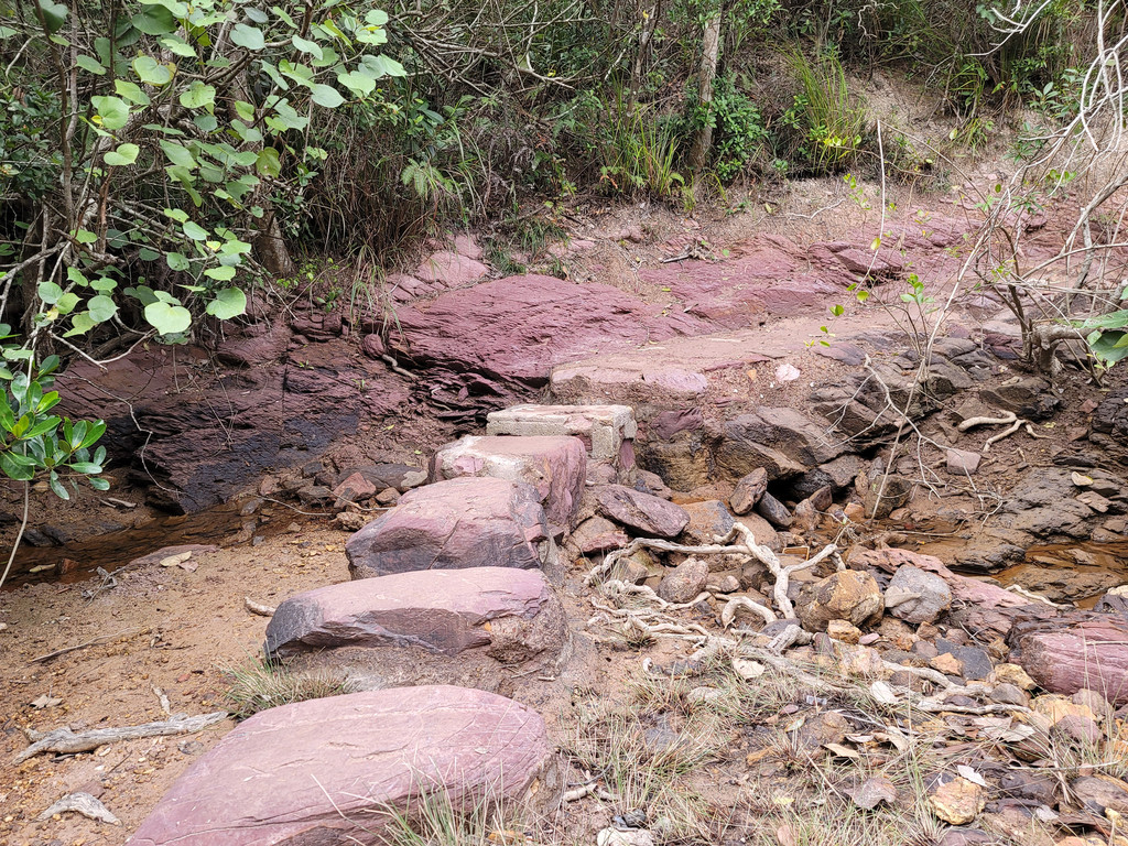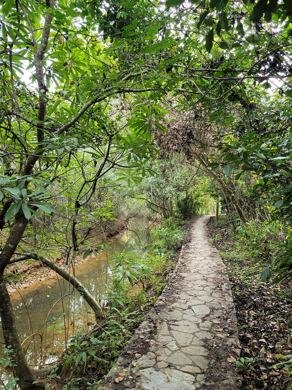 在这些红树林和红色沉积岩中行走,虽然海边路段不多,也是充满乐趣的,经过三桠涌营地之后,路开始进入树林之中,但是整段路还是比较平缓,所以走得很舒服,特别是呼吸着树木之中充沛的负离子氧气,而且路边还有苗三石涧,时不时会听到溪流的水在山石间流淌的声音,甚是悦耳。这段路还会经过两个淹没在树林之中的村庄,上苗田和下苗田,20世纪六七十年代,村民都搬迁之后,原来的房屋就渐渐被树木覆盖,行走在曾经的村道上,已经找不到房屋的痕迹。
