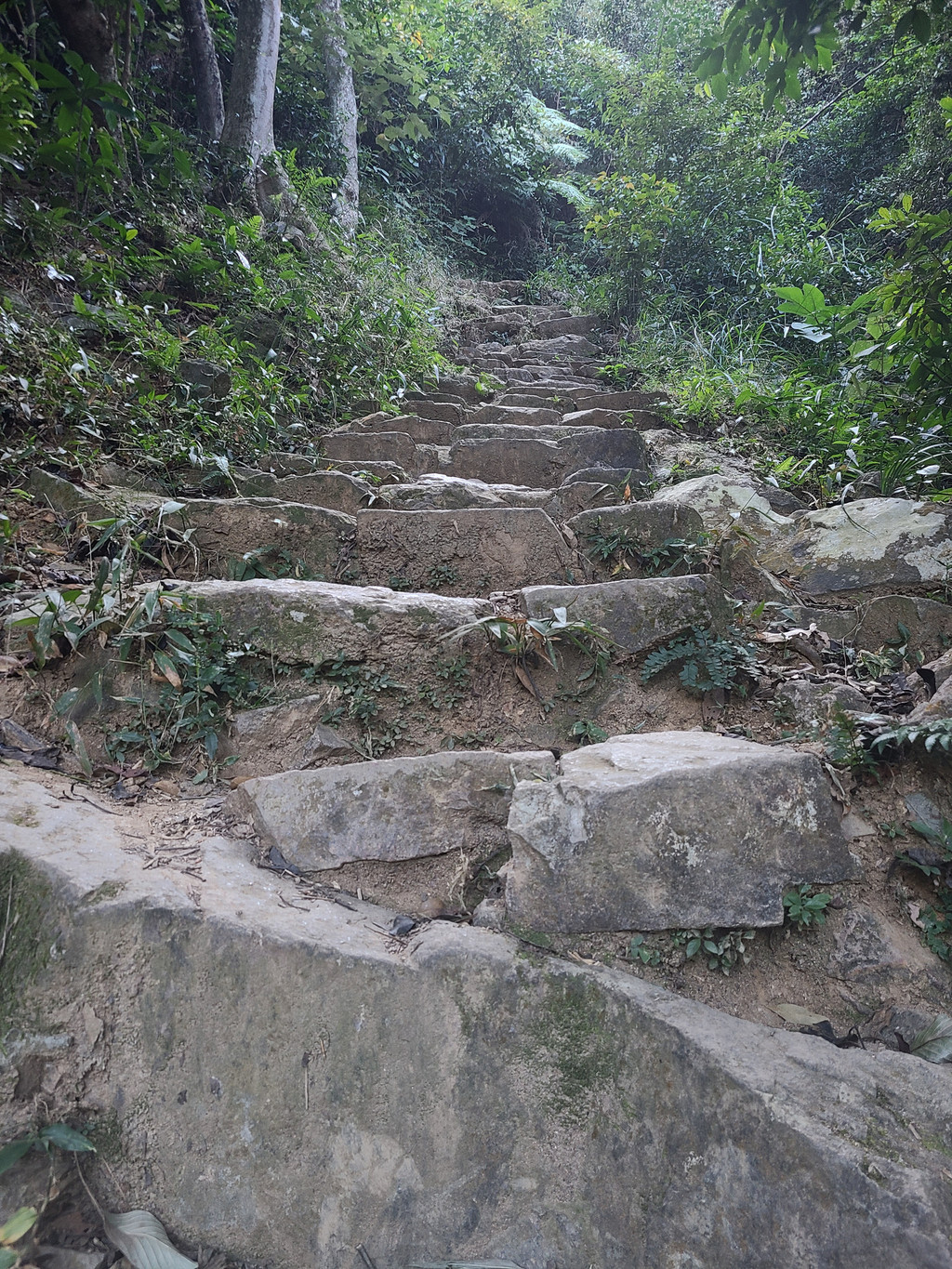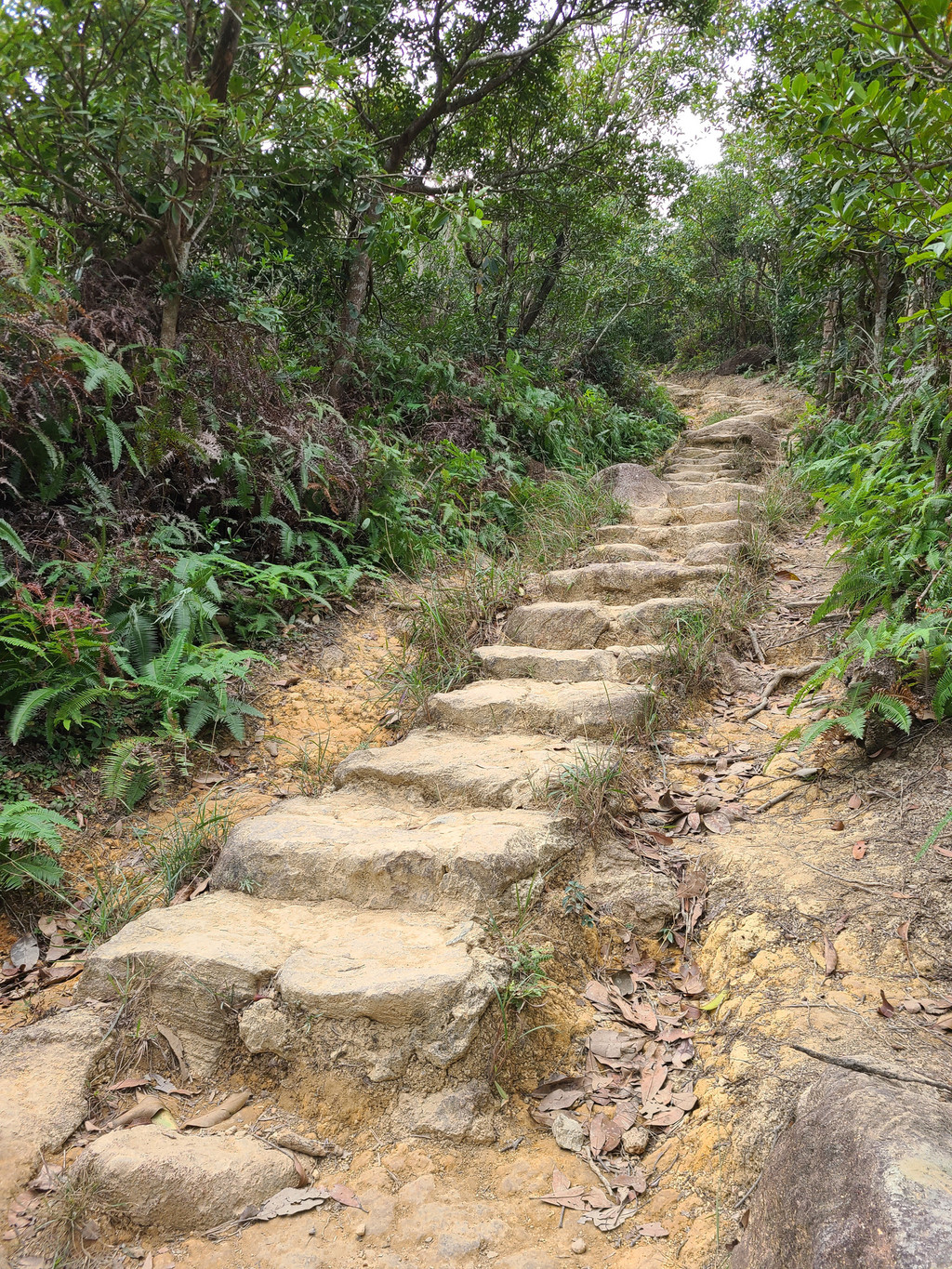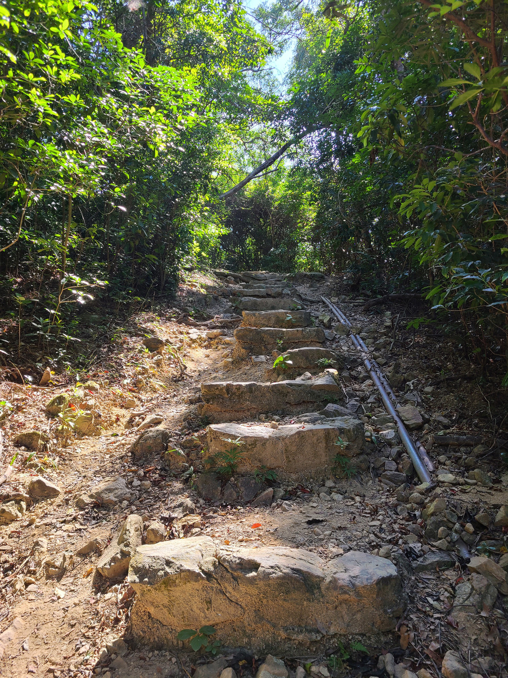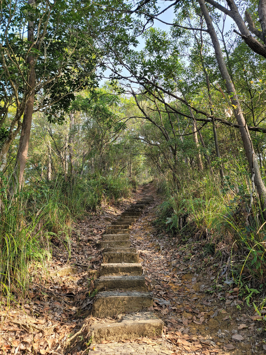 从水塘边的水泥路转上卫奕信径,从这里开始拾级而上,接下来的两公里路都是向上攀登的石阶,水平提升到超过500米,当可以从屏风山的山尖旁经过的时候,这段艰辛的上山阶梯终于结束,后面的路,即便有所起伏,也是在100米水平变化内。