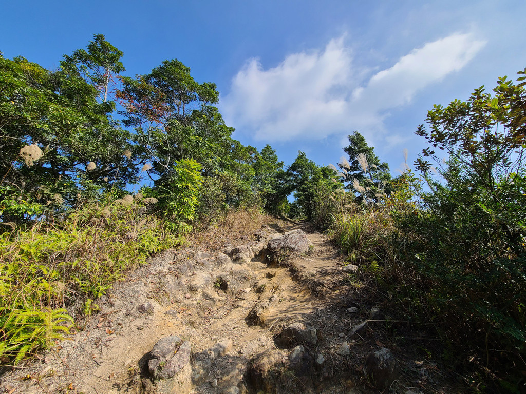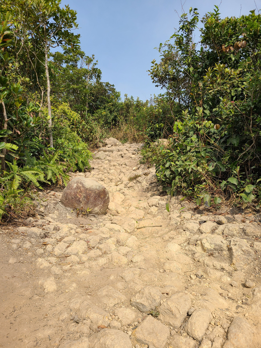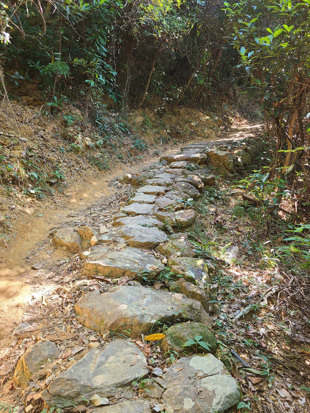 从水塘边的水泥路转上卫奕信径,从这里开始拾级而上,接下来的两公里路都是向上攀登的石阶,水平提升到超过500米,当可以从屏风山的山尖旁经过的时候,这段艰辛的上山阶梯终于结束,后面的路,即便有所起伏,也是在100米水平变化内。