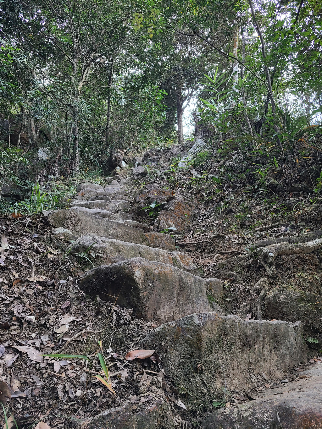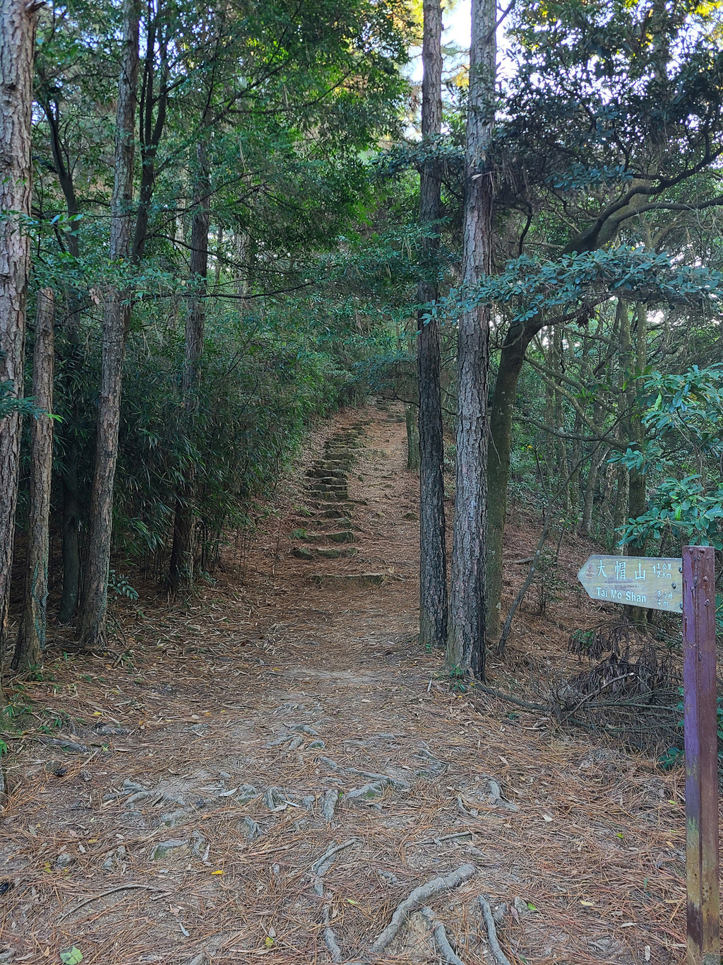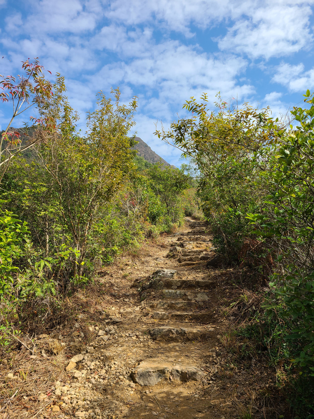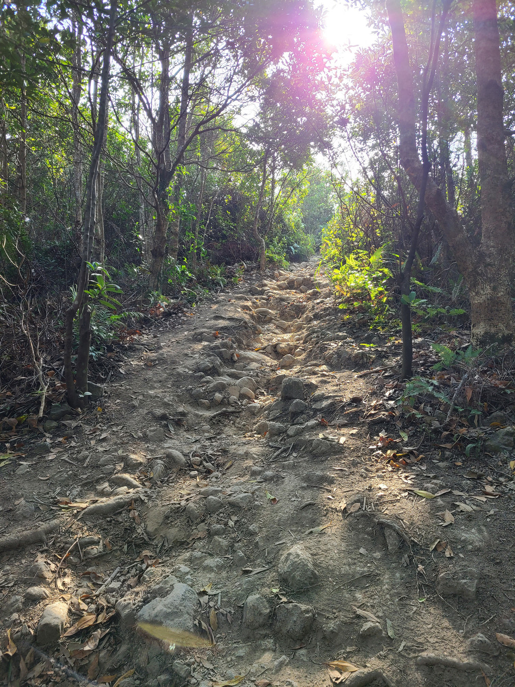 从水塘边的水泥路转上卫奕信径,从这里开始拾级而上,接下来的两公里路都是向上攀登的石阶,水平提升到超过500米,当可以从屏风山的山尖旁经过的时候,这段艰辛的上山阶梯终于结束,后面的路,即便有所起伏,也是在100米水平变化内。