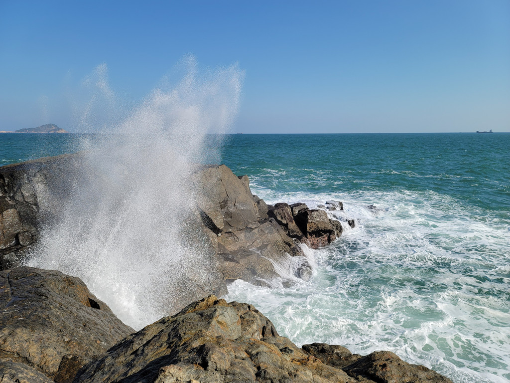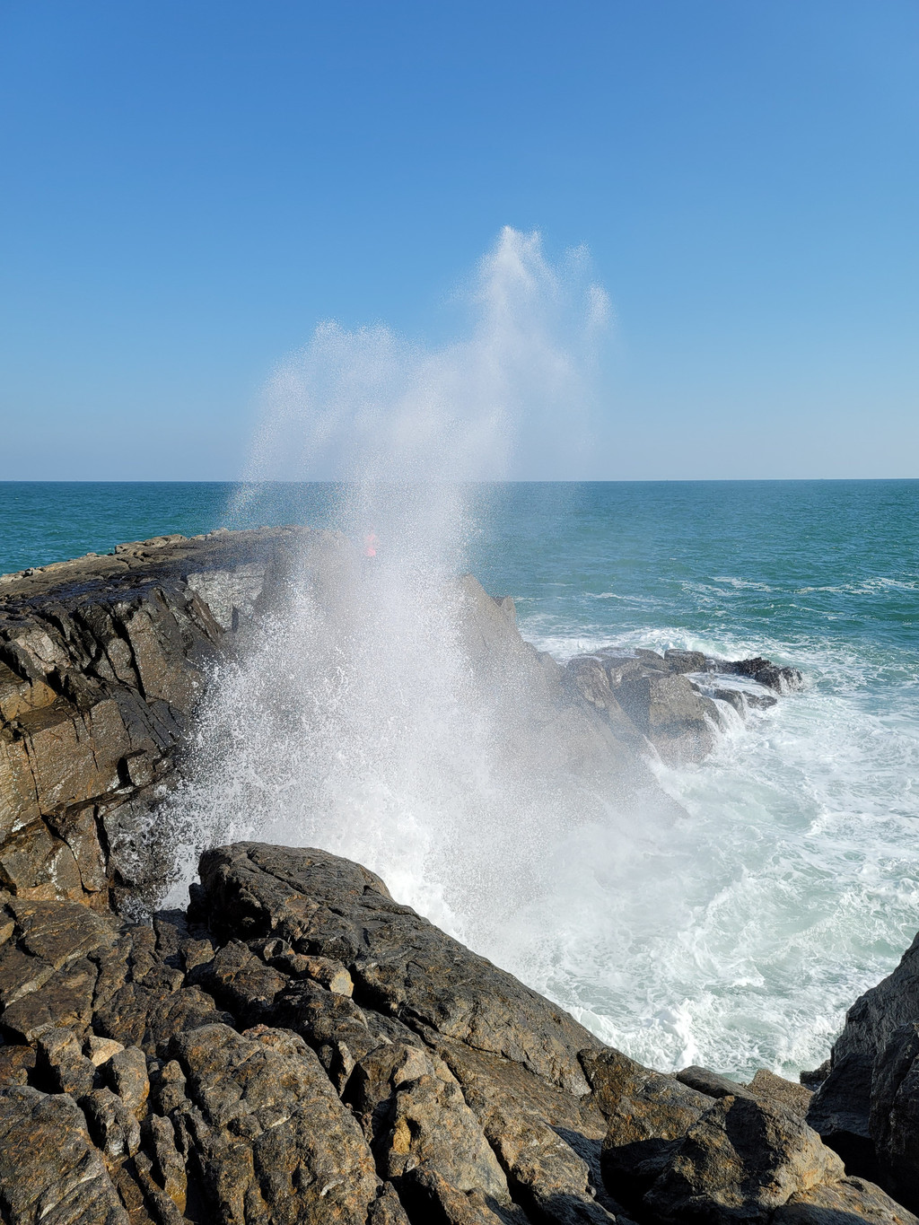 离开营地区域,我们开始今日最困难的路段,攀石前往喷水岩。一步一步从悬崖落下,在崖下的礁石上行走,一个转弯,就看到了声音和景致都是震撼的喷水岩。海水冲击礁石,引起的惊涛拍岸,非笔墨可以形容。在这里坐着,看着汹涌的海浪泛起的水花,在岩石上形成的彩虹,每一次都不尽相同,似乎任时间流淌,都不会在意。不过我们还要赶回程的船,差不多时间,也要离开这个惬意的地方。