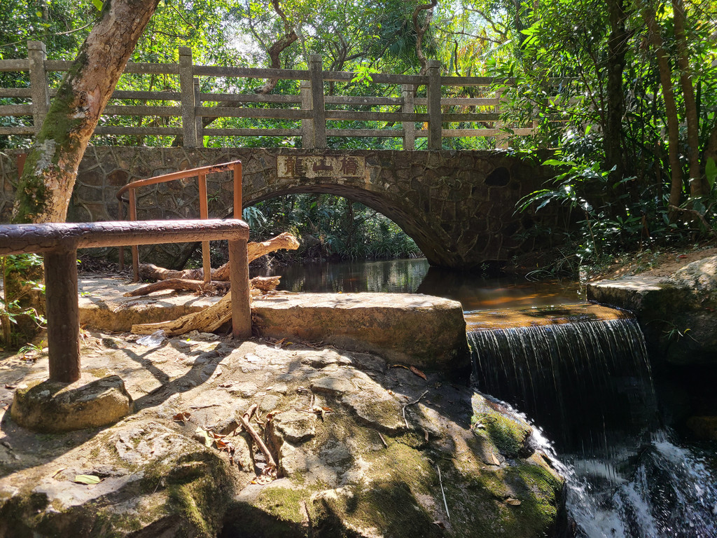 大部分游人,都会止步于此,我们沿着流水响郊游径继续行走,道路维护一般,有不少破损的地方,不过行人很少,偶然才会遇上,慢慢的斜路上山。之后接上一小段卫奕信径,一个偶然的途中,可以从高处看到流水响水塘的全景,还可以远眺深圳的莲塘到罗湖,另一个方向还能勉强看到深圳湾的高楼群。