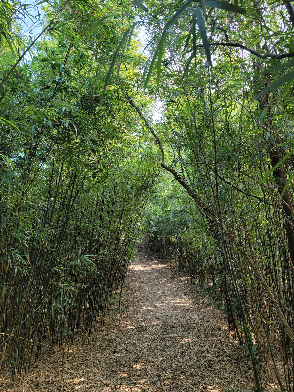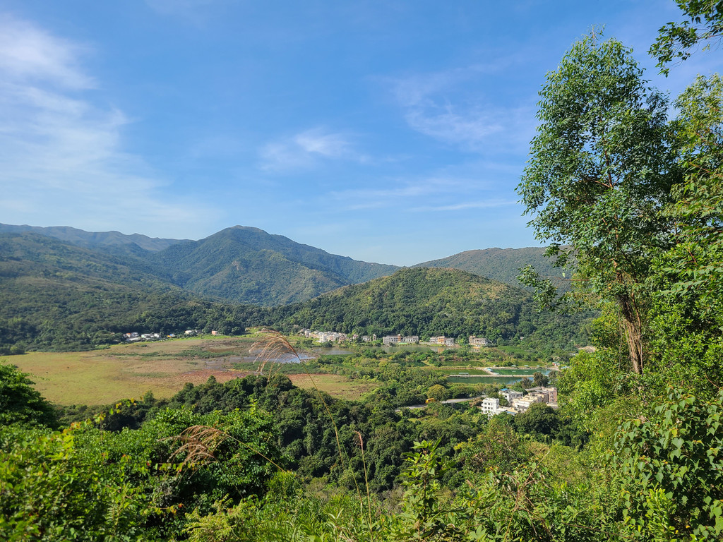 而转身远眺,则是位于不同山岭围绕的盆地之中,平坦的八乡和锦田,甚至可以远眺深圳。之后我们选择另一条路下山,明显比靠近瀑布的那段好走,中间还有一段不短的竹林,只可惜天色渐晚,没有出彩之处。
