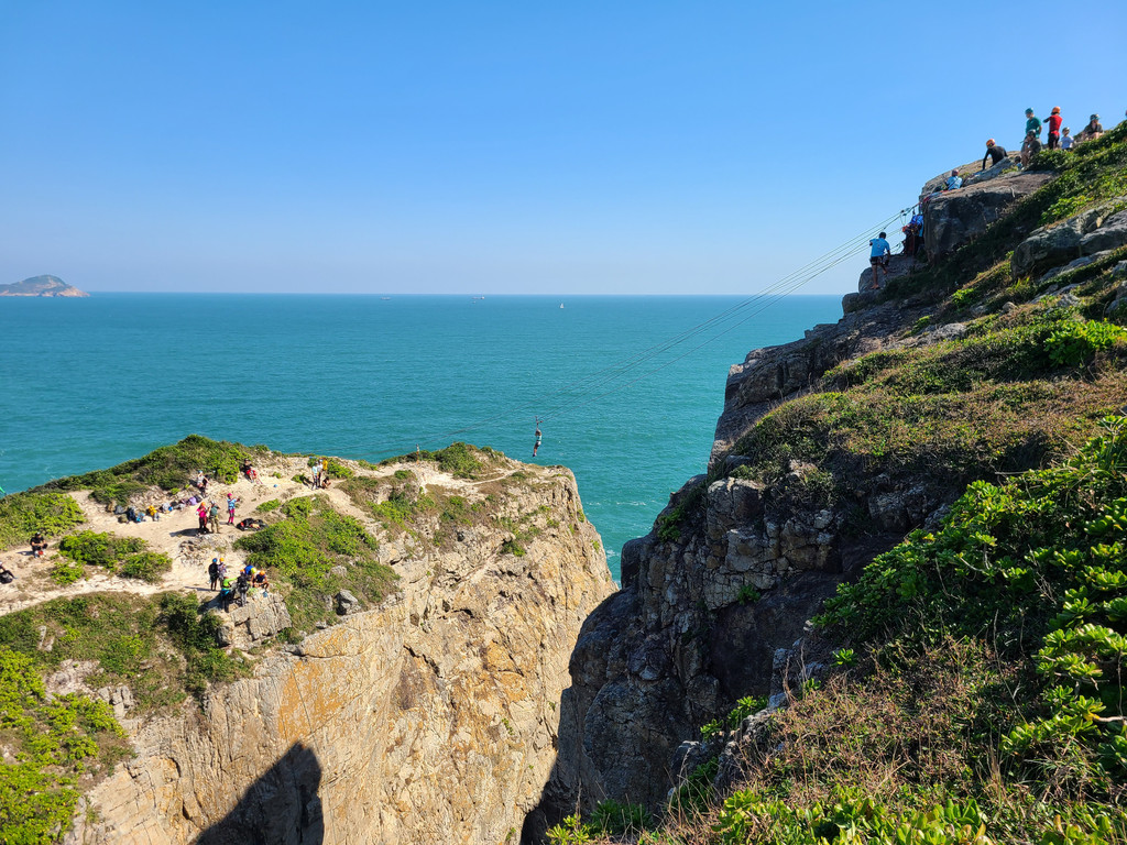 到达南堂顶的发射站之后,落东龙洲炮台的一段路况比较差,基本是草丛中的碎沙石路,而且相对陡峭,还有路边的树和草丛不时骚扰。幸好我们早有准备,手套带上之后,借助手套可以利用树枝和大的石块轻松应对,特别是今天如此晴好干燥的,路算是比较好行走的。行到营地附近,会见到有人玩悬崖飞索,攀岩。悬崖飞索,在两座悬崖之间沿铁索滑下,面对壮丽海景,可能也没心情观看,这绝对是挑战心与力的挑战。不过该活动唔可以Walk In,一定要参加一日包团。