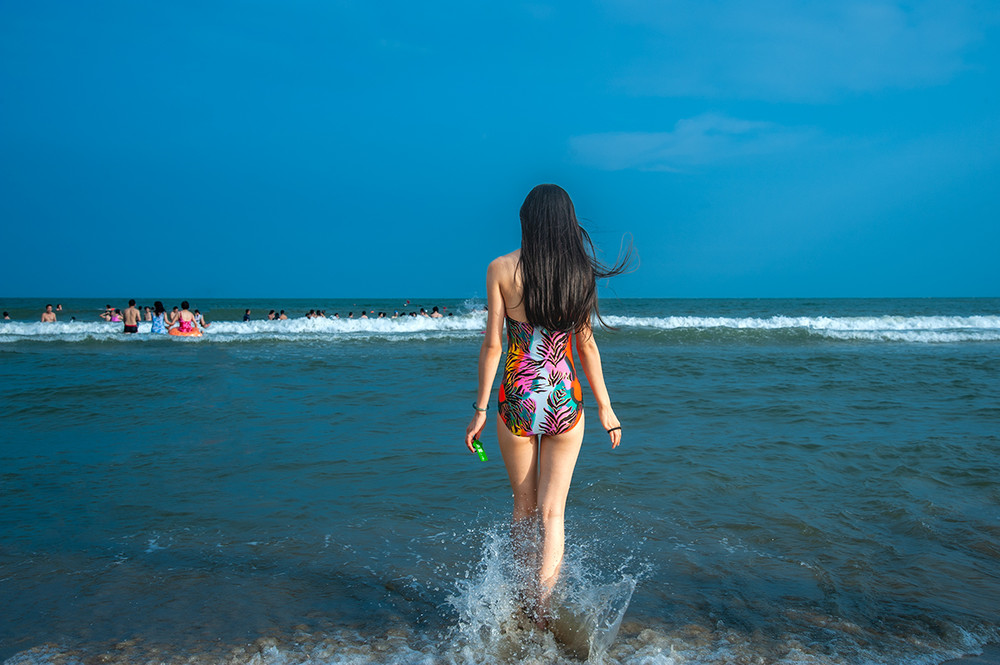 窈窕淑女,随风飘逸的长发,带着浪花飞溅的动感……有朋友已经拿到书,说喜欢这张海滩踏浪而行的照片。那次是磨房资深驴友“笑忘書”召集我们在珠海荷包岛露营,当时大家都去海滩游泳,队友yoyo穿着一身色彩鲜艳的泳衣,却腼腆地裹着一块大丝巾,我看泳衣很衬她的身材,让她扔掉丝巾走向大海,在海滩上抓拍了几张照片,果然出彩。如果要说不足,就是忘记让她放下手上的钥匙牌和橡皮筋,于是看到书中走向大海的她,左手拿着绿色钥匙牌,右手套着橡皮筋。