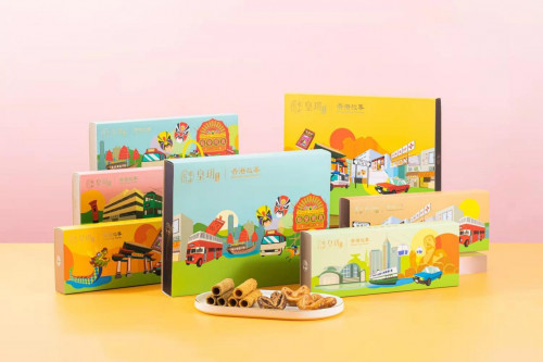 皇玥香港故事系列的设计有一系列为人熟悉的香港的特色,包括10大最受旅客欢迎的代表性建筑和文化特色:维港帆船、双层巴士、电车叮叮、怀旧招牌、雪糕车等,再配上香港著名的地标建筑物,如大佛、会展等。另外,纸盒的设计可以连成一线,更能拼凑出一幅满载香港昔日情怀的「全景图」。